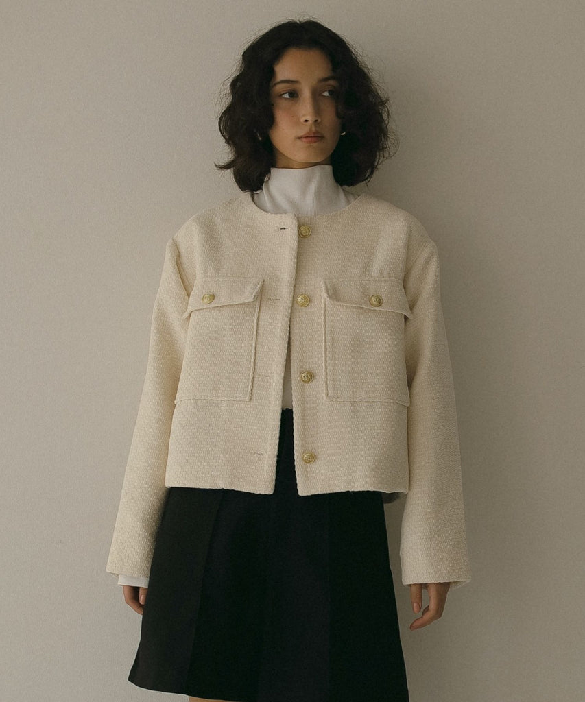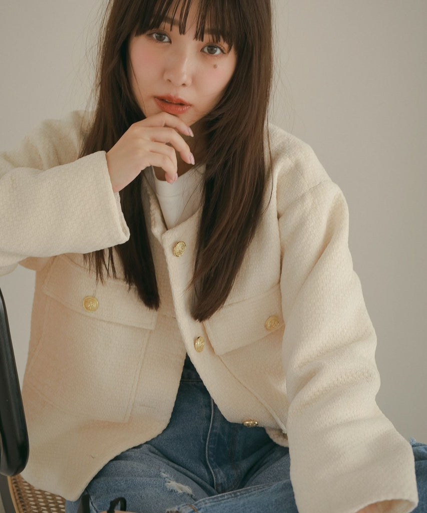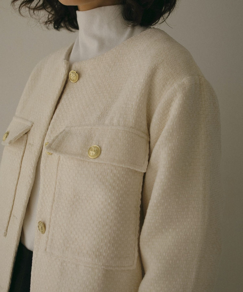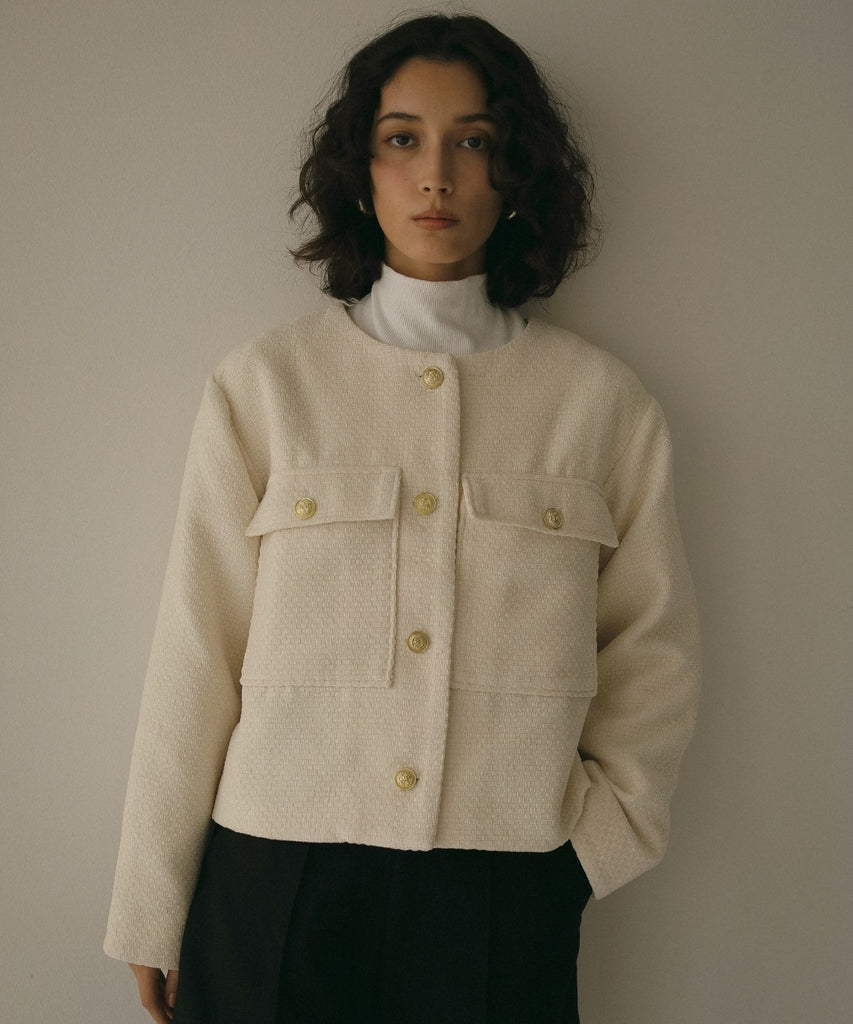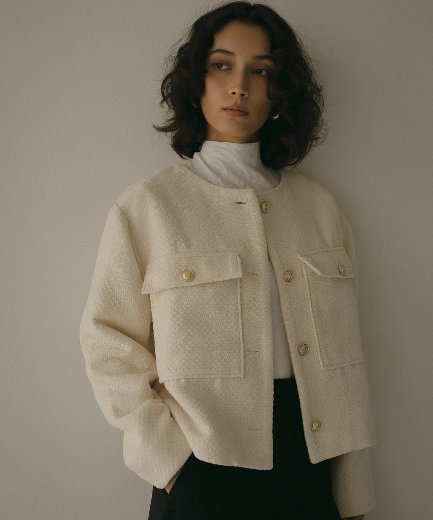 ざっくりとしたファンシーツイードを贅沢に使用したノーカラージャケット。金ボタンがアクセントになり、クラシカルな雰囲気を演出してくれます。スタイルUPを叶えてくれるショート丈は、さまざまななボトムスやワンピースとの相性もバッチリ。カジュアルからきれいめまで、幅広いスタイリングをお楽しみいただけるおすすめアウター。