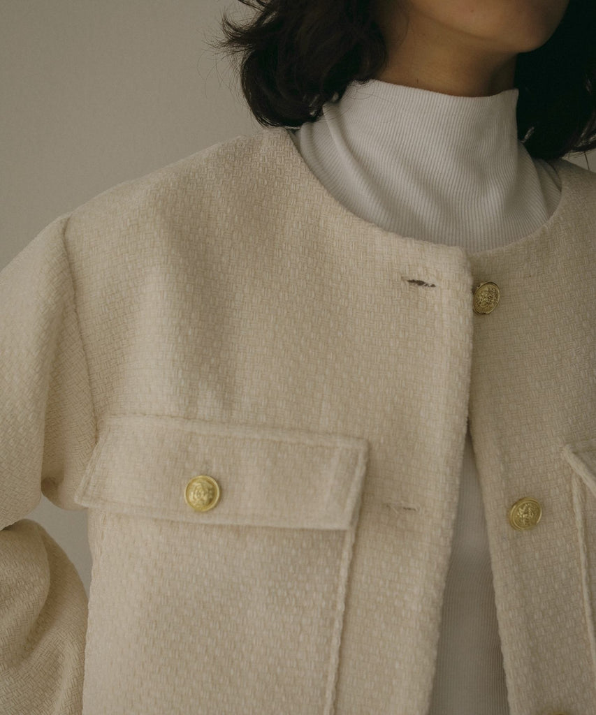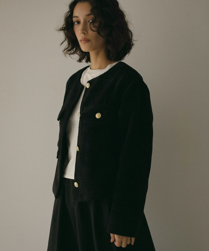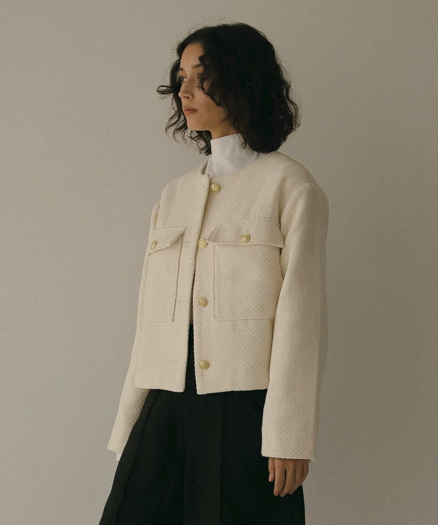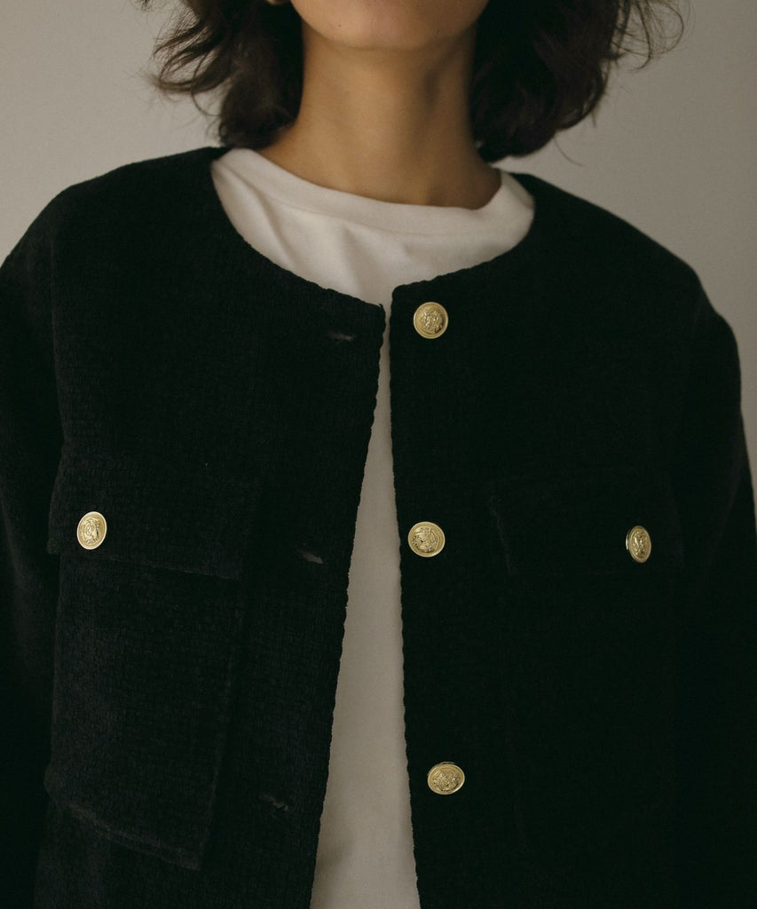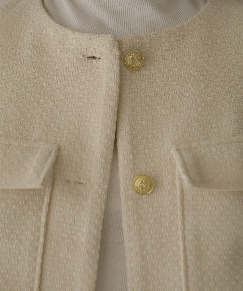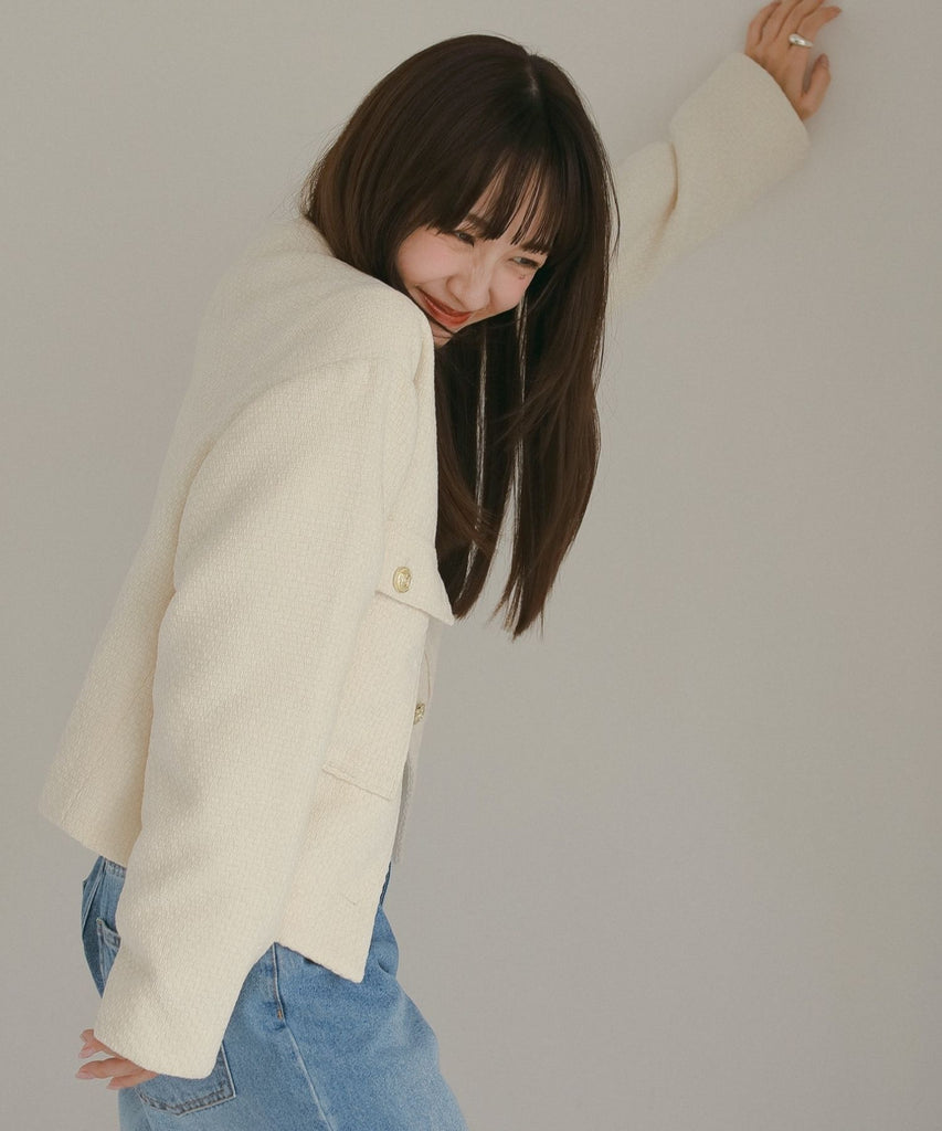 ざっくりとしたファンシーツイードを贅沢に使用したノーカラージャケット。金ボタンがアクセントになり、クラシカルな雰囲気を演出してくれます。スタイルUPを叶えてくれるショート丈は、さまざまななボトムスやワンピースとの相性もバッチリ。カジュアルからきれいめまで、幅広いスタイリングをお楽しみいただけるおすすめアウター。