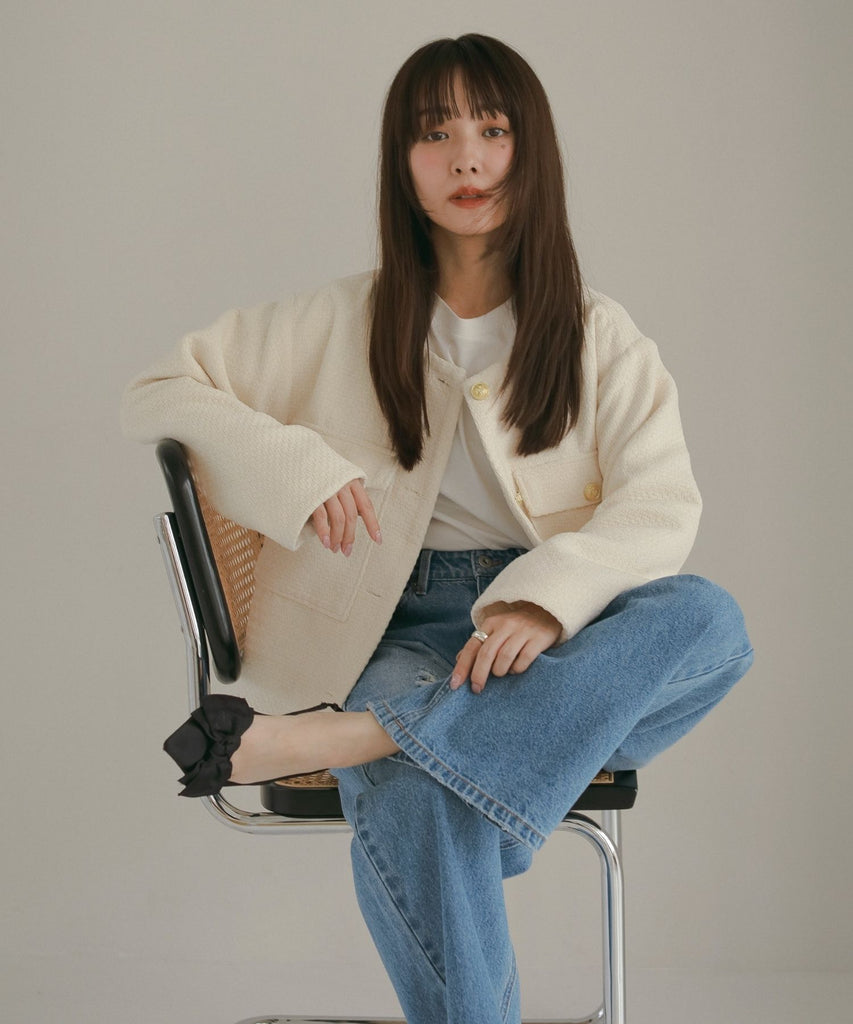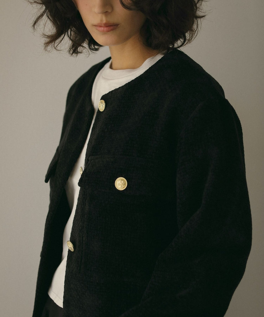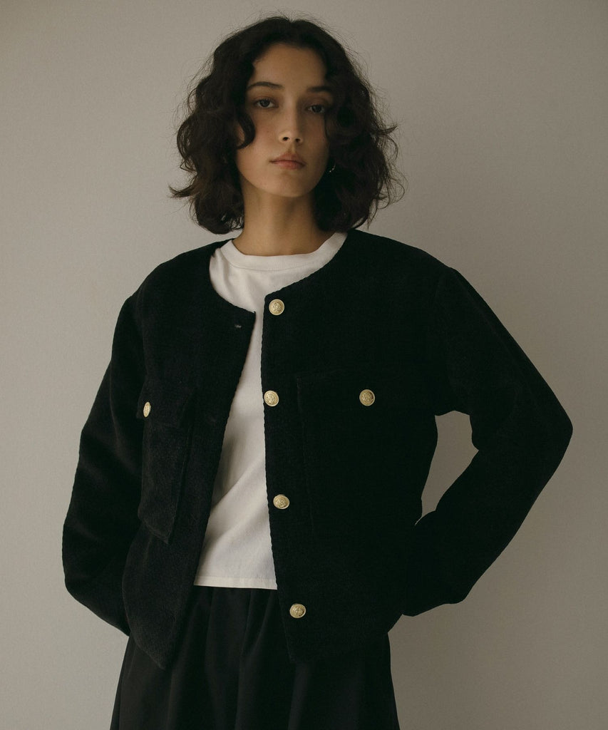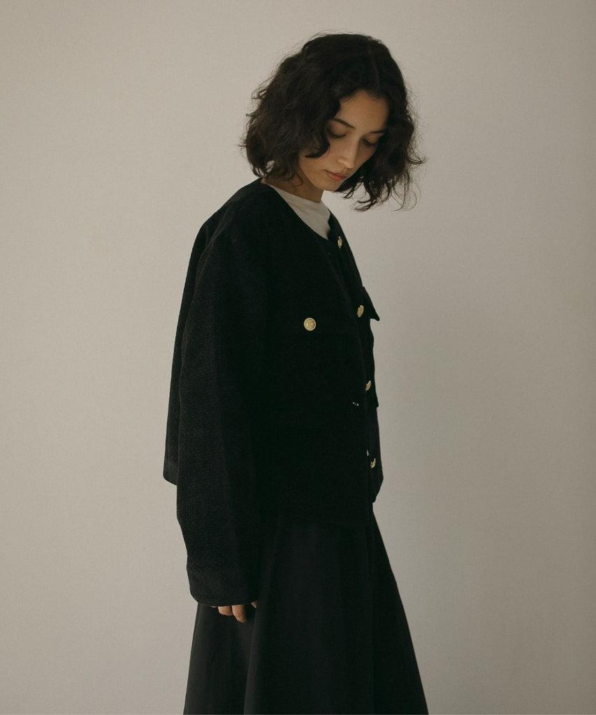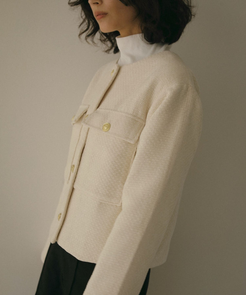 ざっくりとしたファンシーツイードを贅沢に使用したノーカラージャケット。金ボタンがアクセントになり、クラシカルな雰囲気を演出してくれます。スタイルUPを叶えてくれるショート丈は、さまざまななボトムスやワンピースとの相性もバッチリ。カジュアルからきれいめまで、幅広いスタイリングをお楽しみいただけるおすすめアウター。