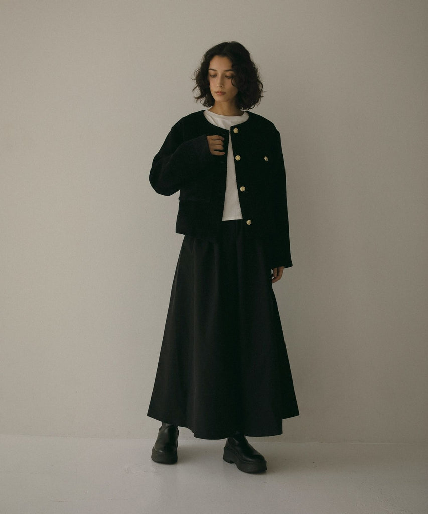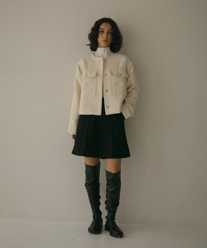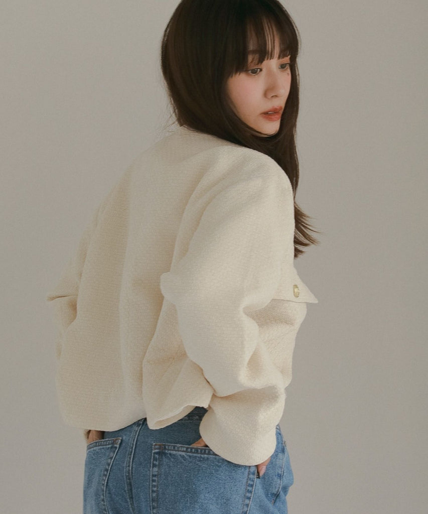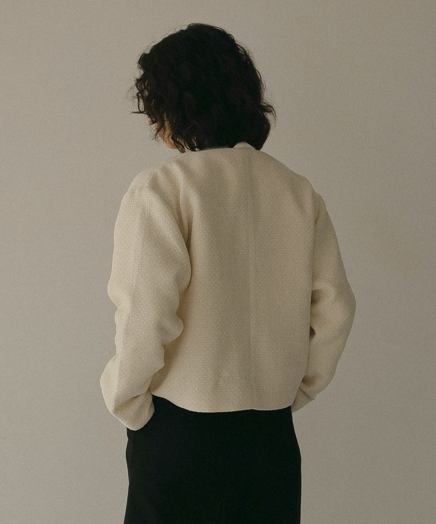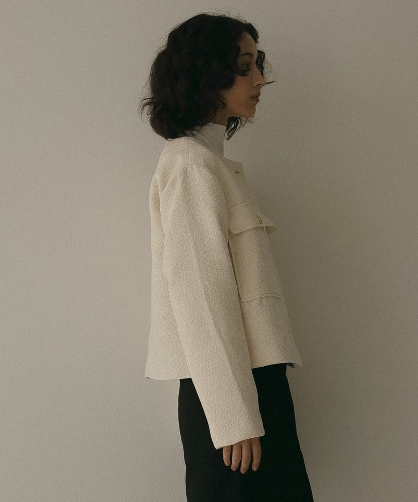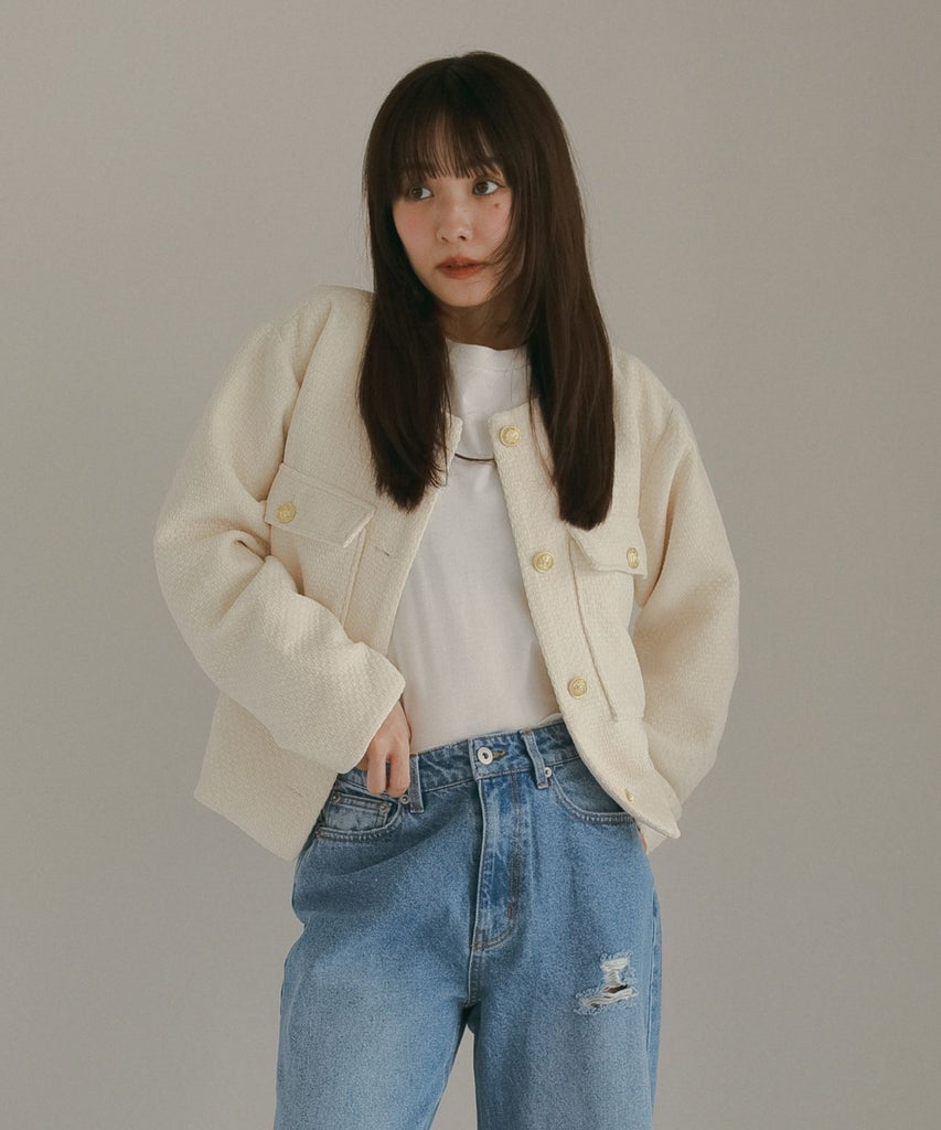 ざっくりとしたファンシーツイードを贅沢に使用したノーカラージャケット。金ボタンがアクセントになり、クラシカルな雰囲気を演出してくれます。スタイルUPを叶えてくれるショート丈は、さまざまななボトムスやワンピースとの相性もバッチリ。カジュアルからきれいめまで、幅広いスタイリングをお楽しみいただけるおすすめアウター。