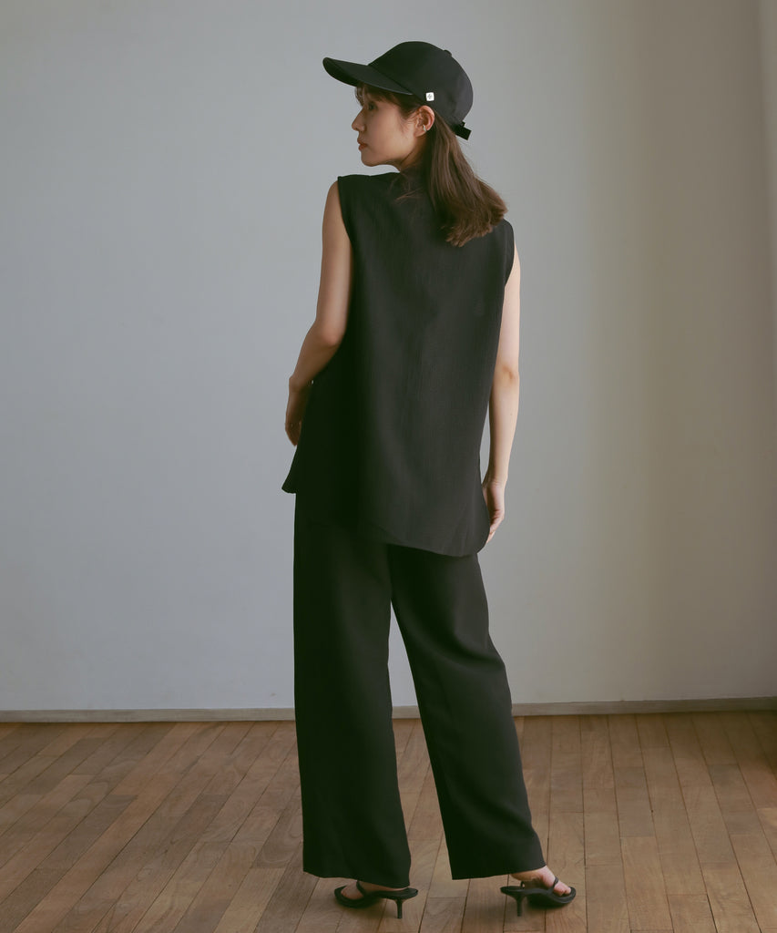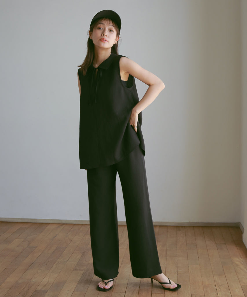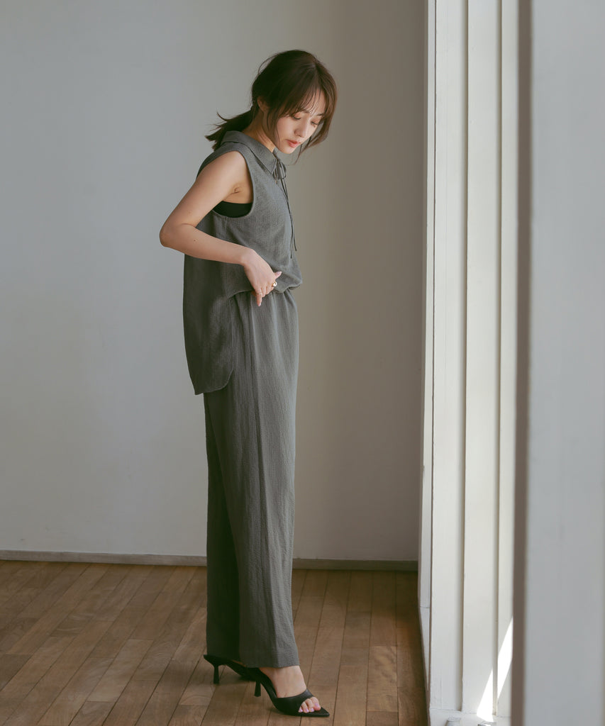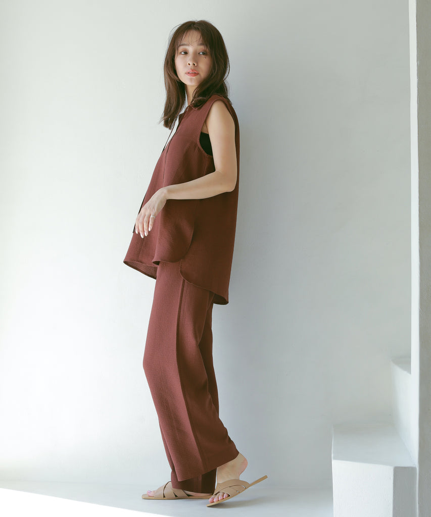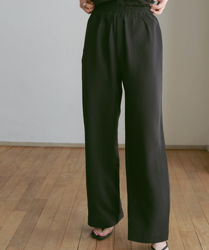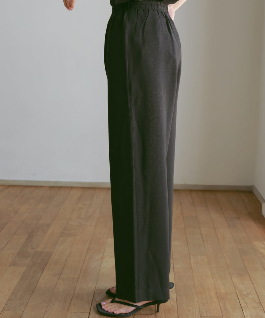 大人っぽいリラックムードなストレートシルエット。ハイウエストパンツなので、らくちんでもしっかり脚長効果が。ウエストはゴムなので、暑い夏でも快適に過ごしていただけます。