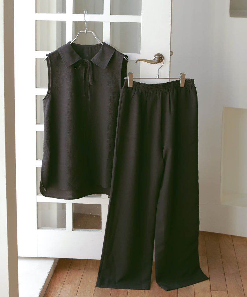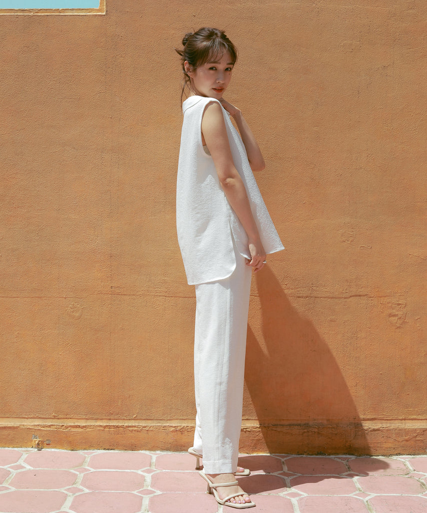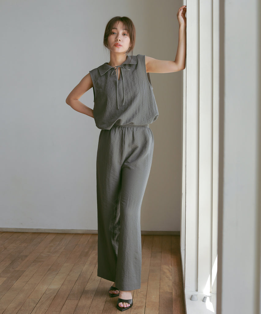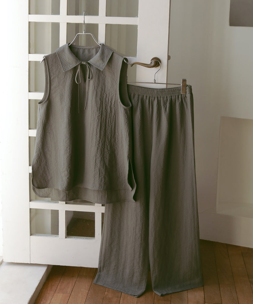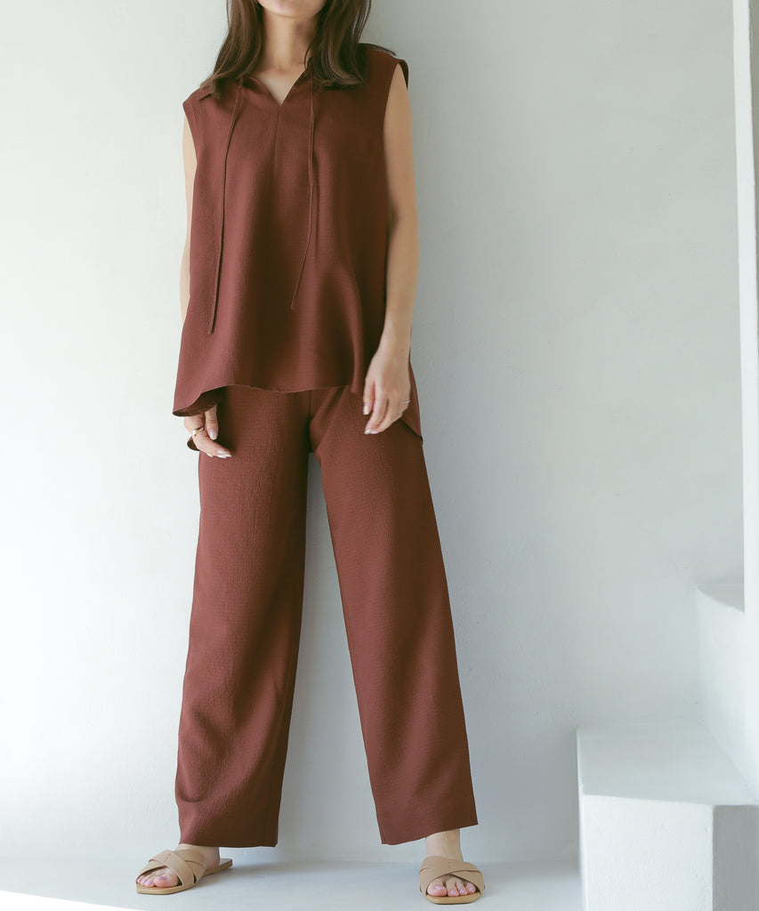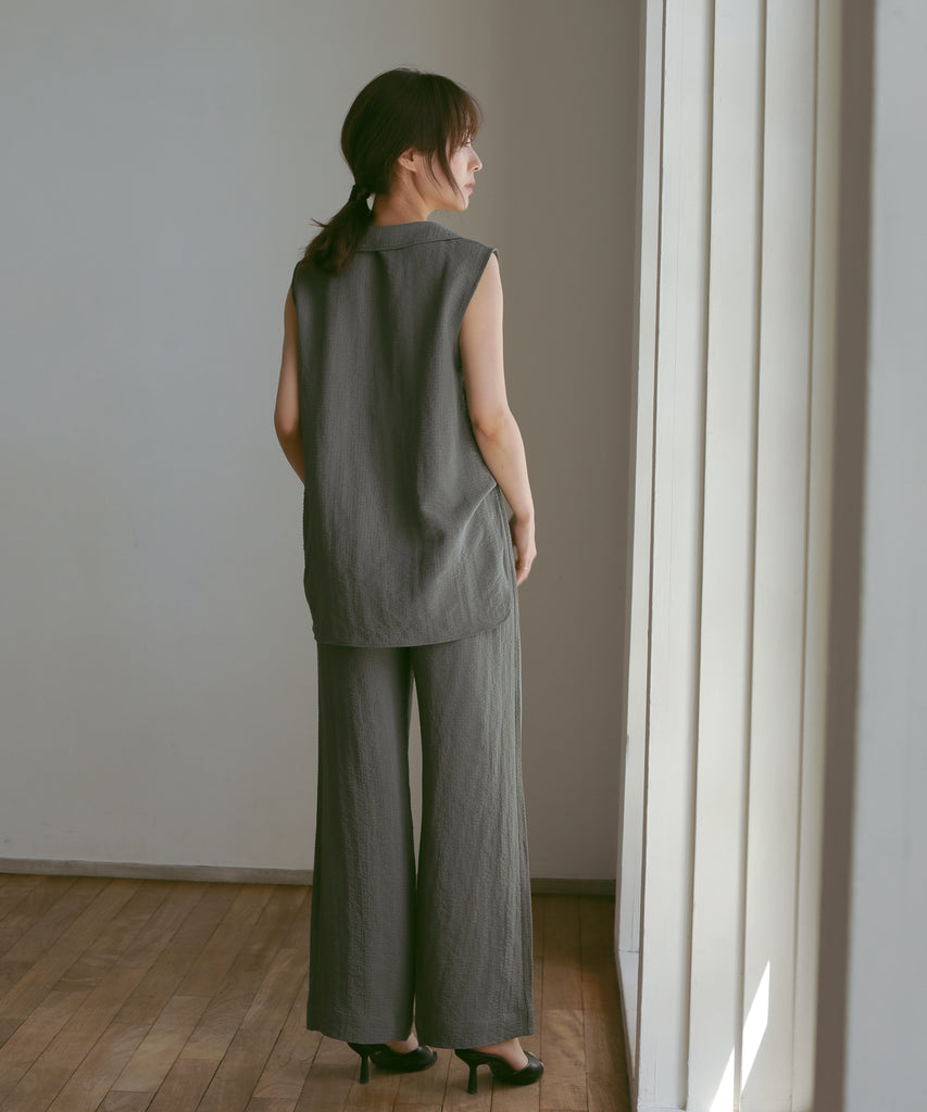 大人っぽいリラックムードなストレートシルエット。ハイウエストパンツなので、らくちんでもしっかり脚長効果が。ウエストはゴムなので、暑い夏でも快適に過ごしていただけます。