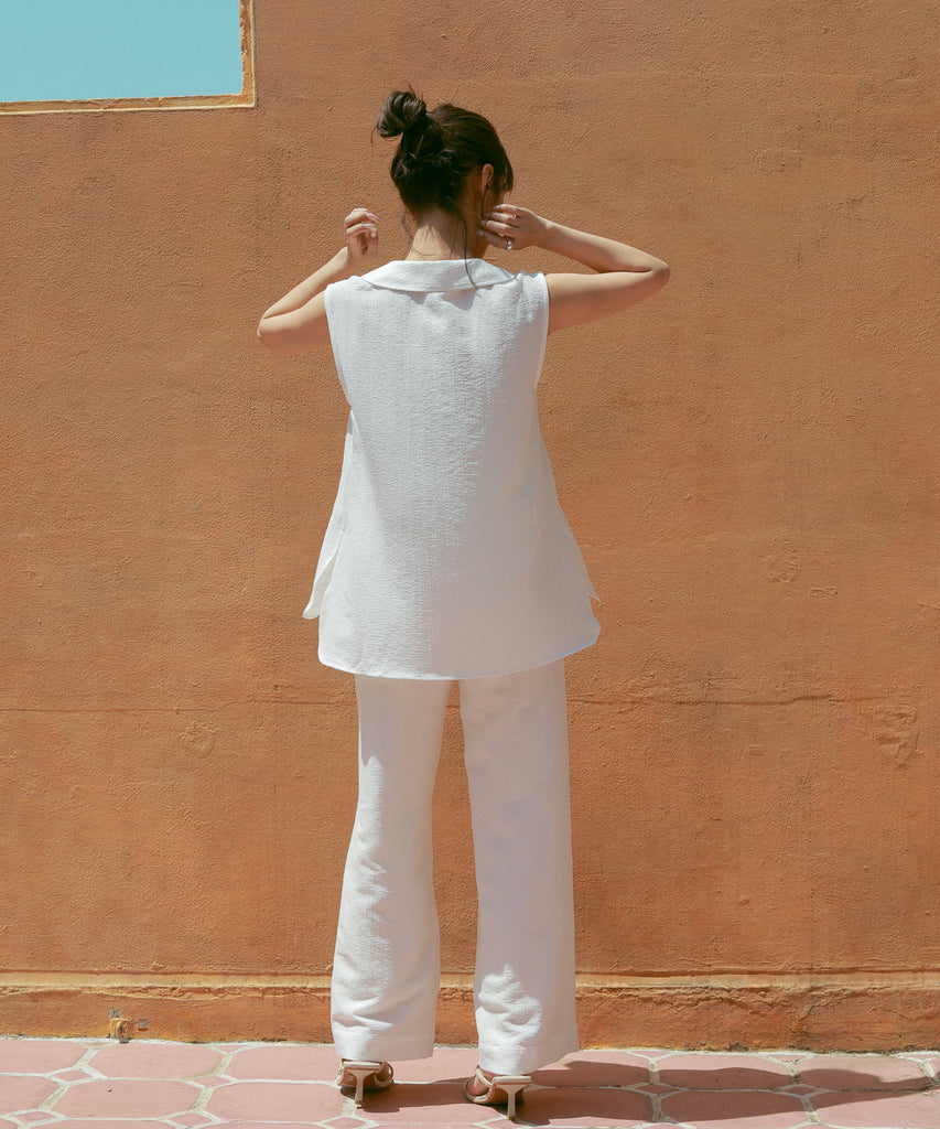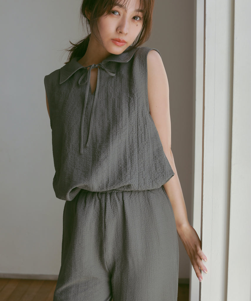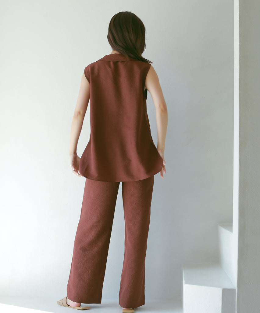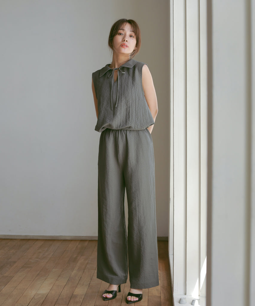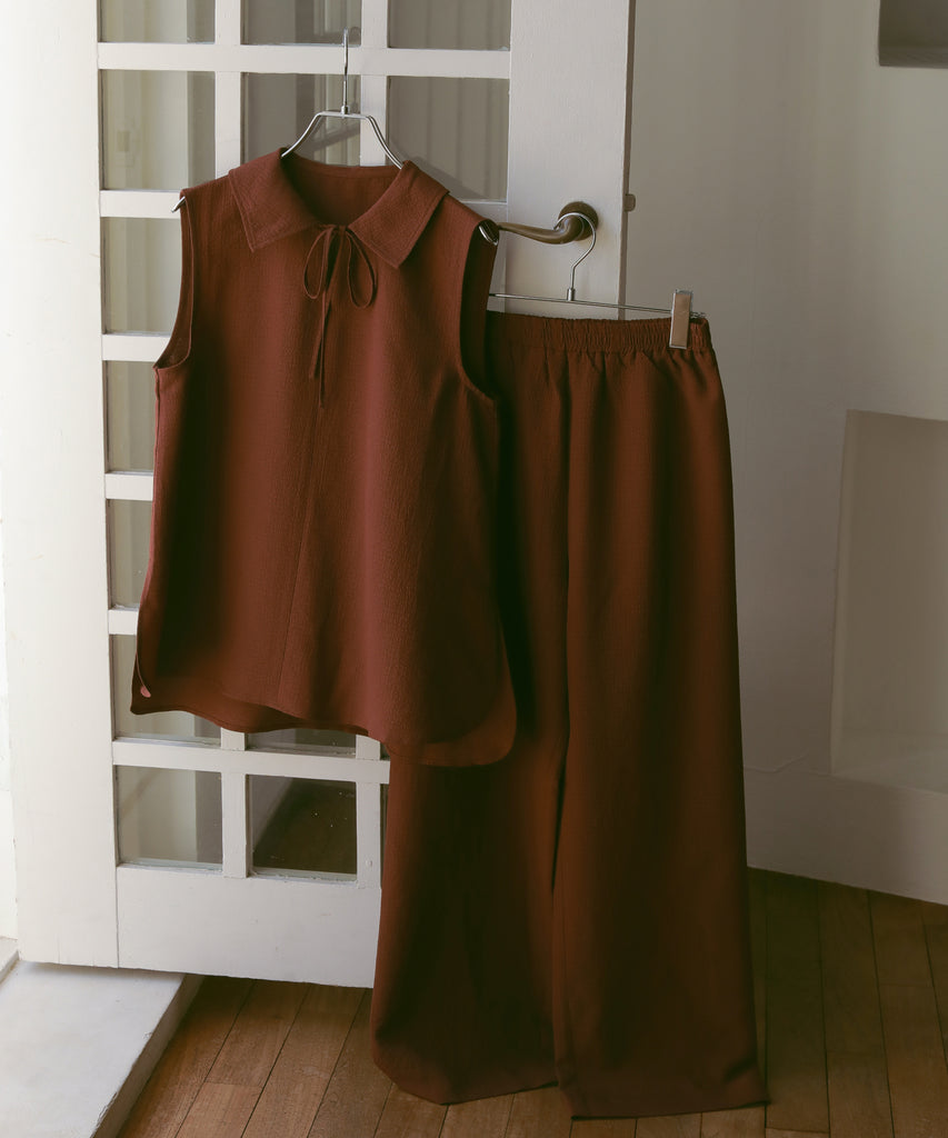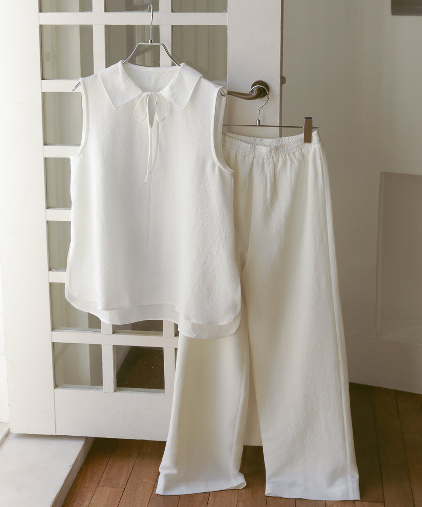 大人っぽいリラックムードなストレートシルエット。ハイウエストパンツなので、らくちんでもしっかり脚長効果が。ウエストはゴムなので、暑い夏でも快適に過ごしていただけます。