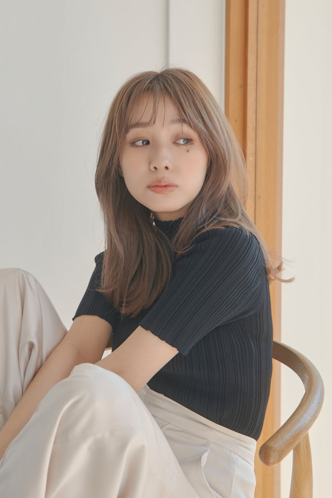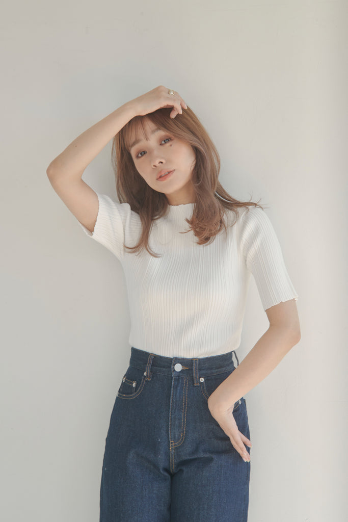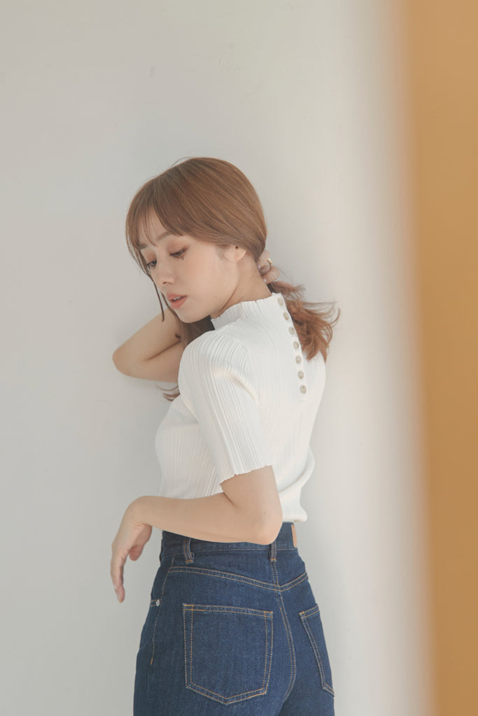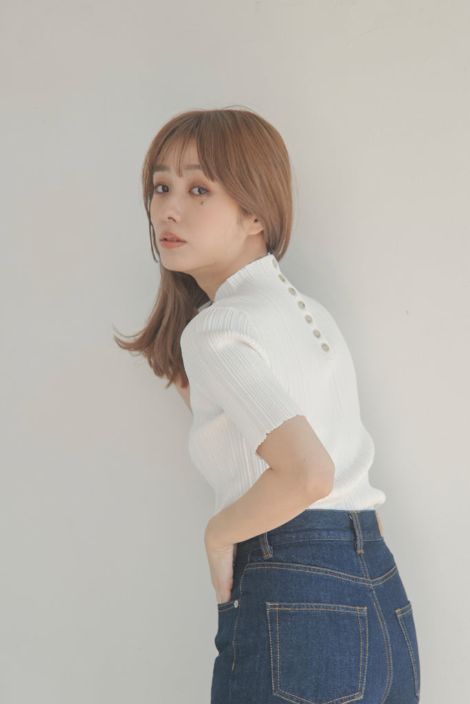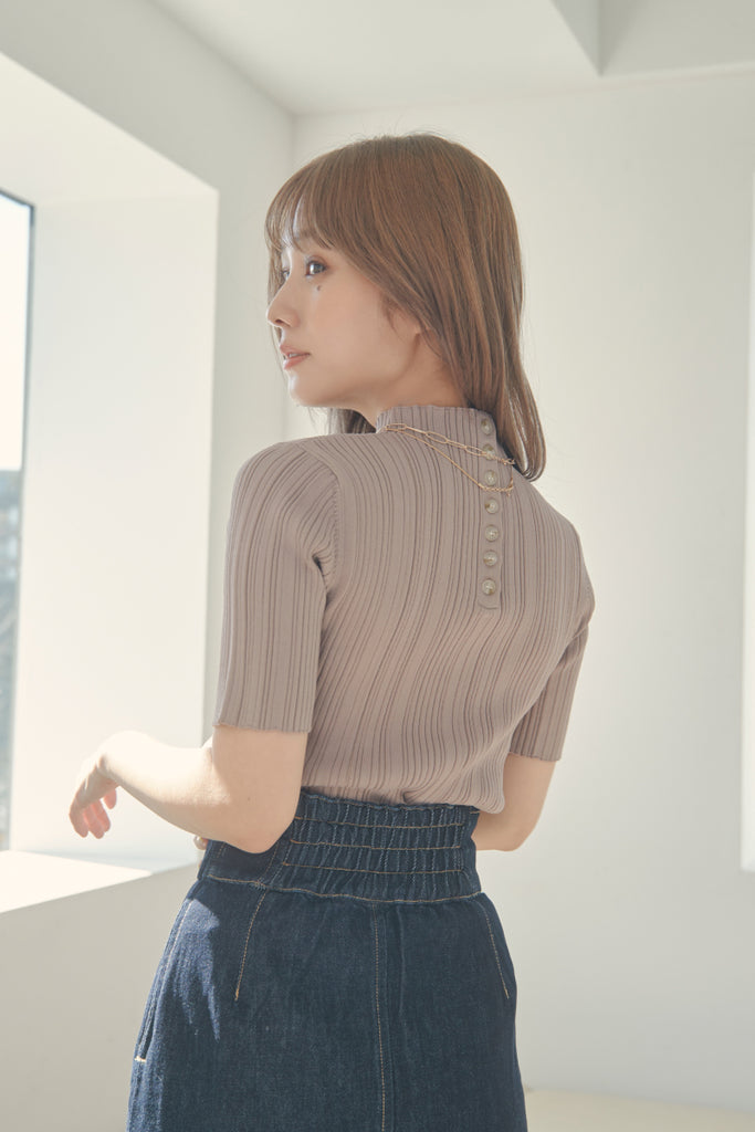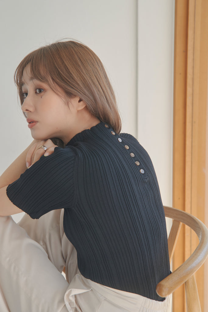 バックのボタンがポイントのベーシックなニットTOPSです!5分袖で夏手前まで長い間ご着用いただけます。デニム合わせのシンプルなコーディネートでもお洒落に決まるアイテムです!