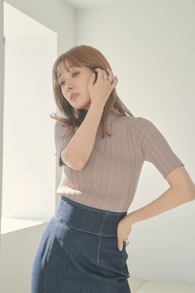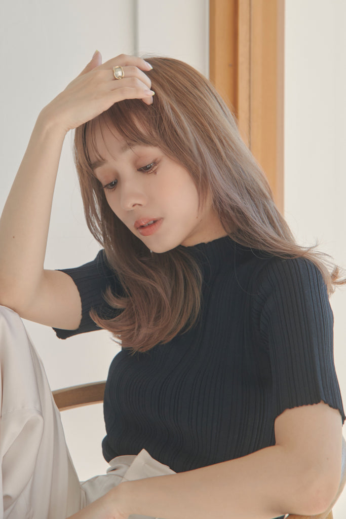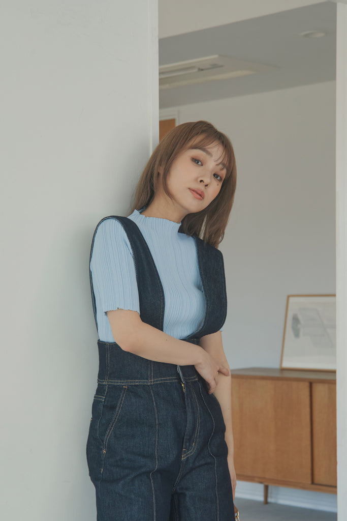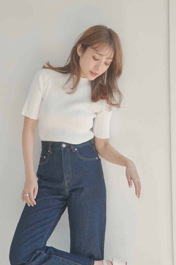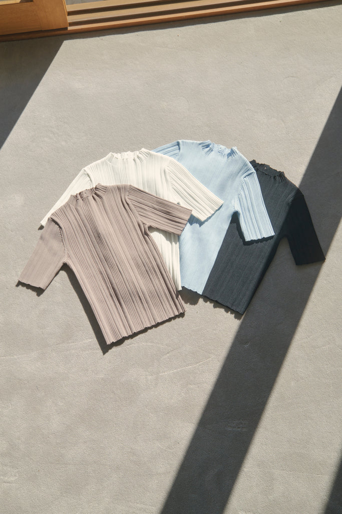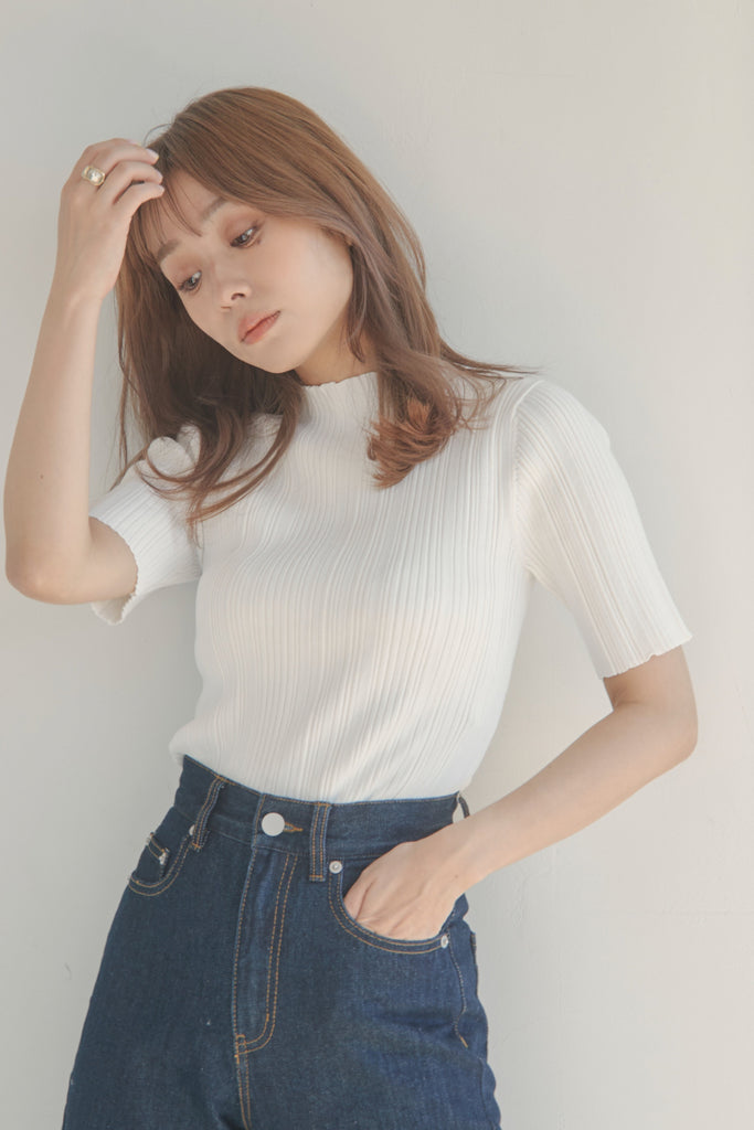 バックのボタンがポイントのベーシックなニットTOPSです!5分袖で夏手前まで長い間ご着用いただけます。デニム合わせのシンプルなコーディネートでもお洒落に決まるアイテムです!