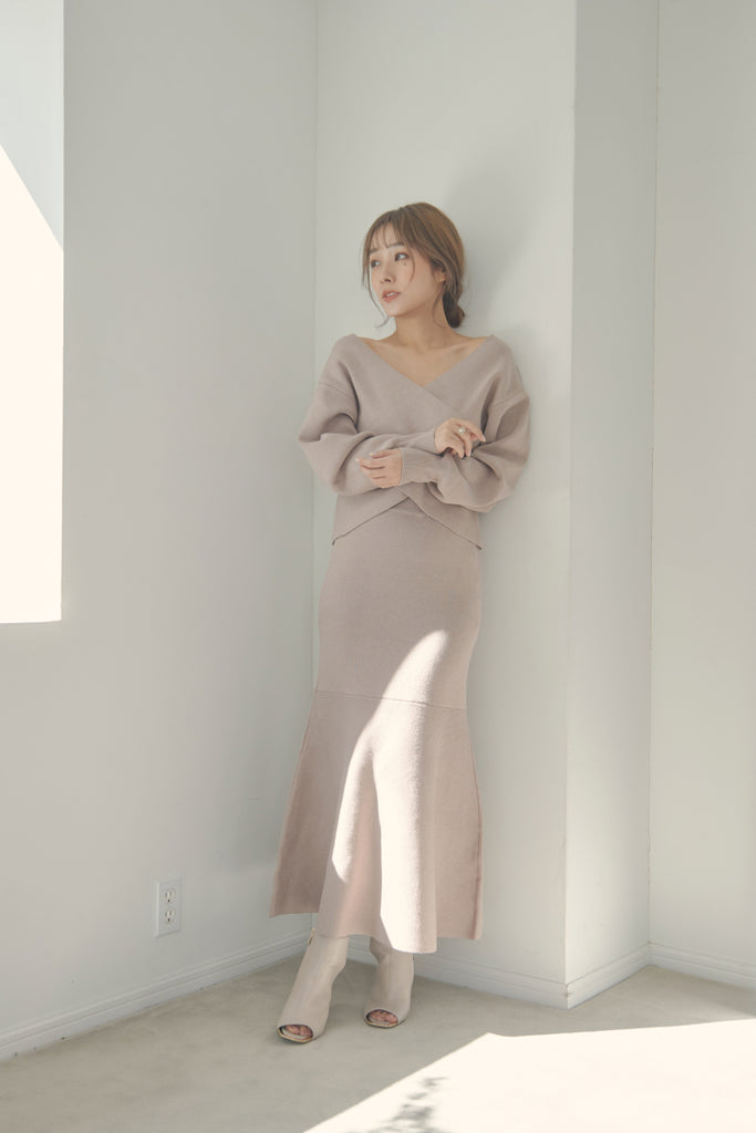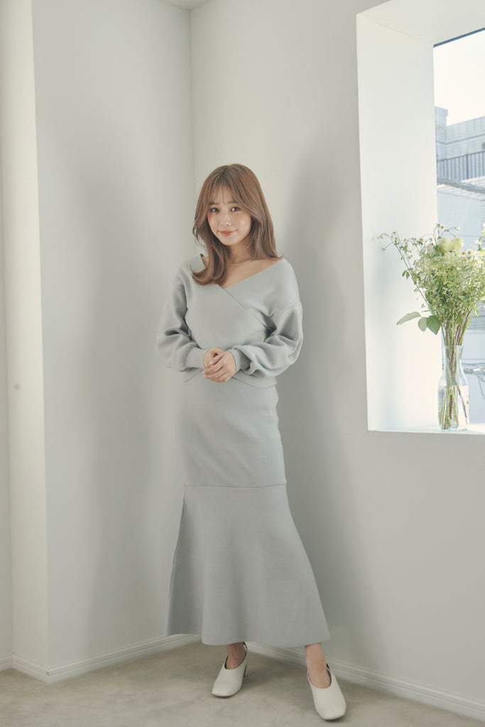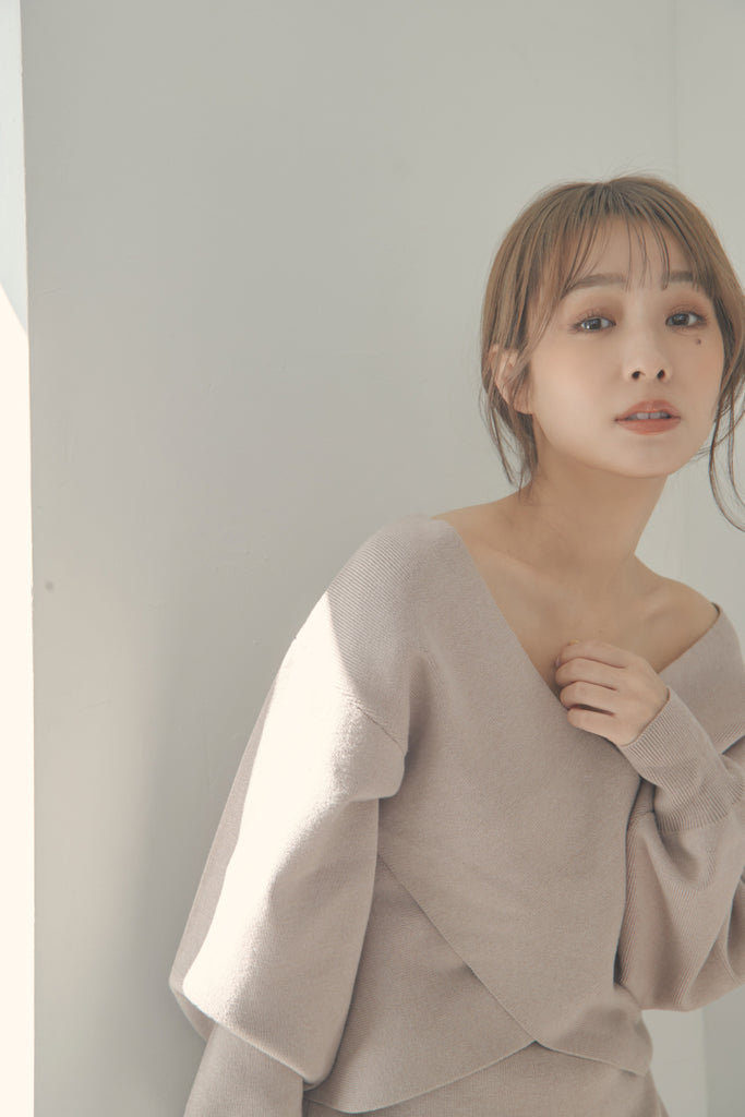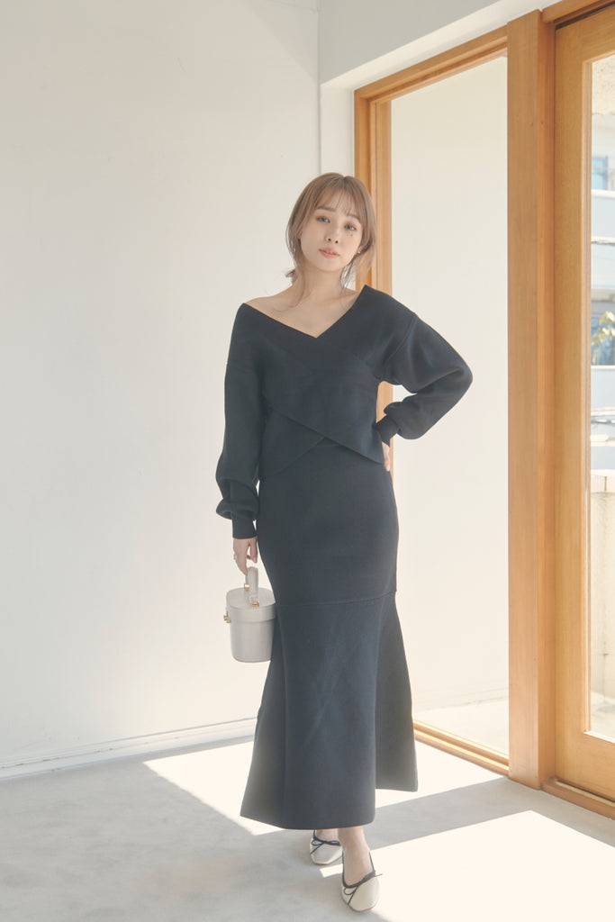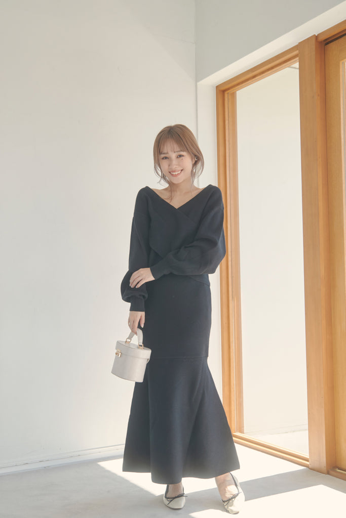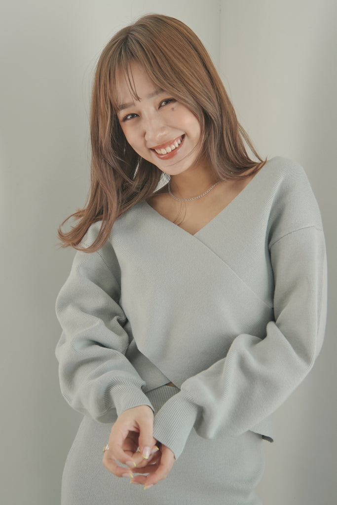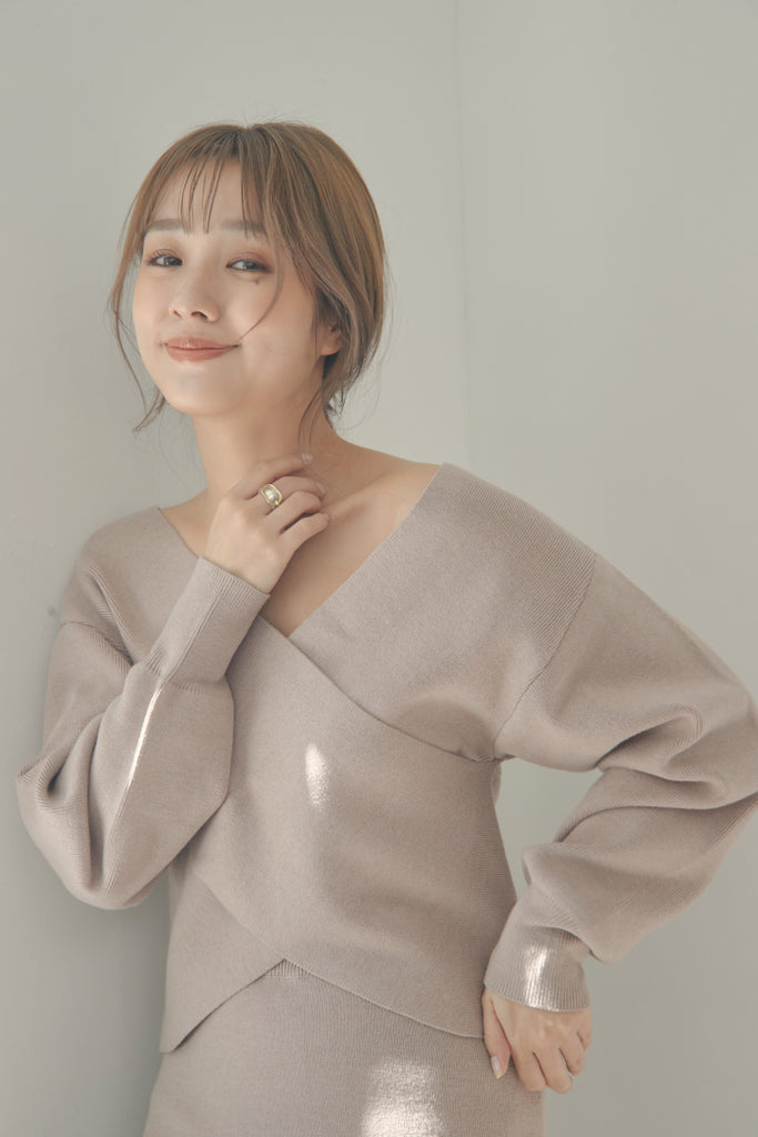 カシュクールのデザインが可愛いニットセットアップです。