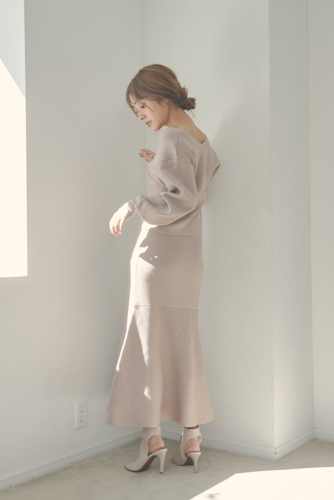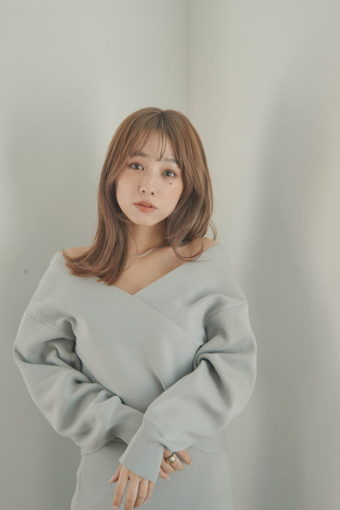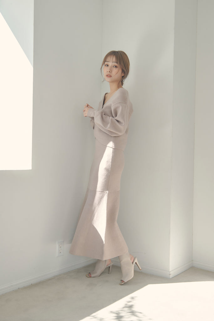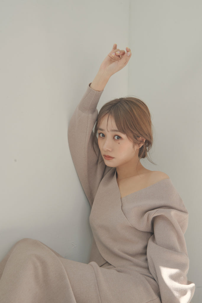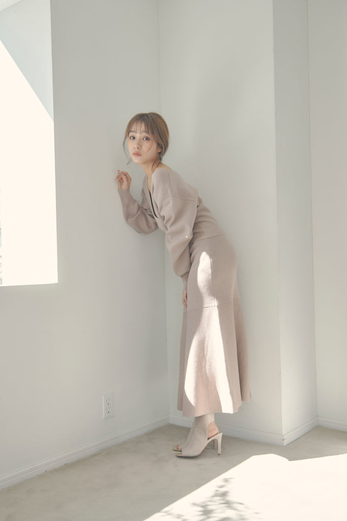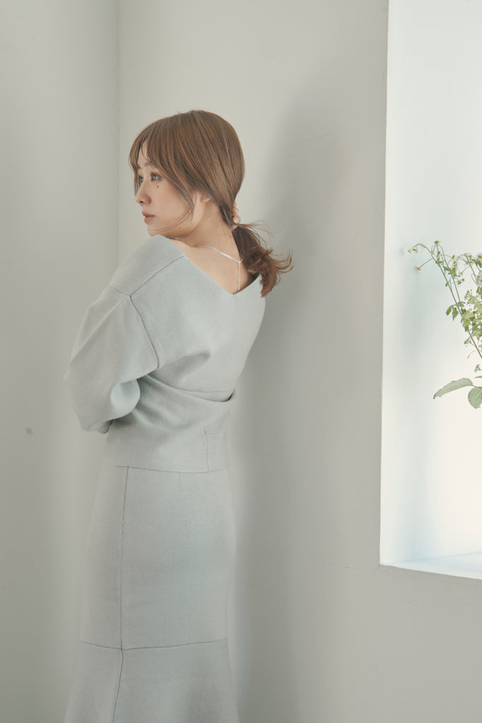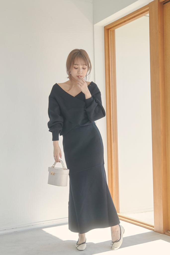 カシュクールのデザインが可愛いニットセットアップです。