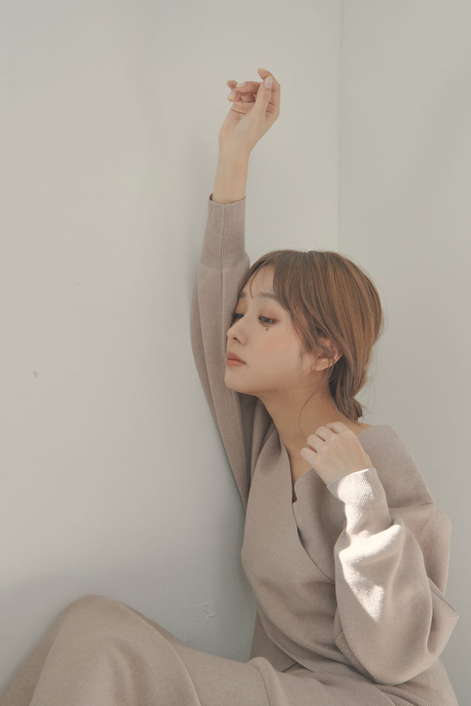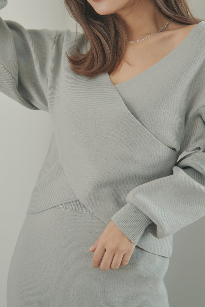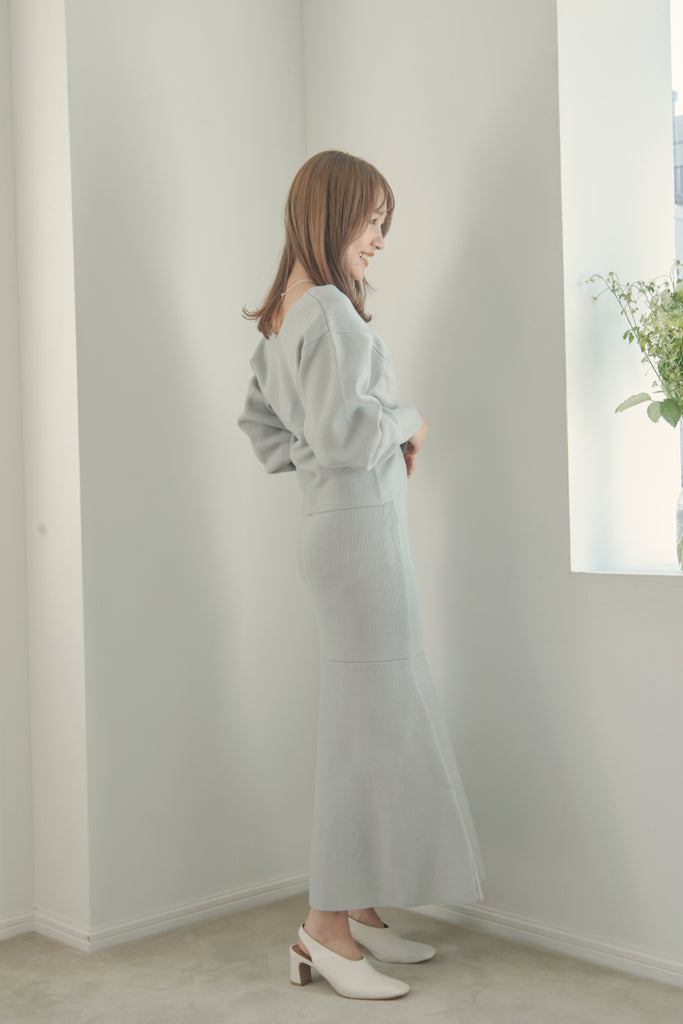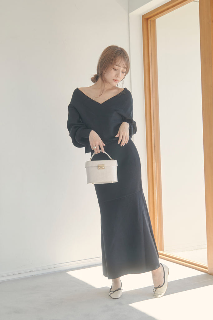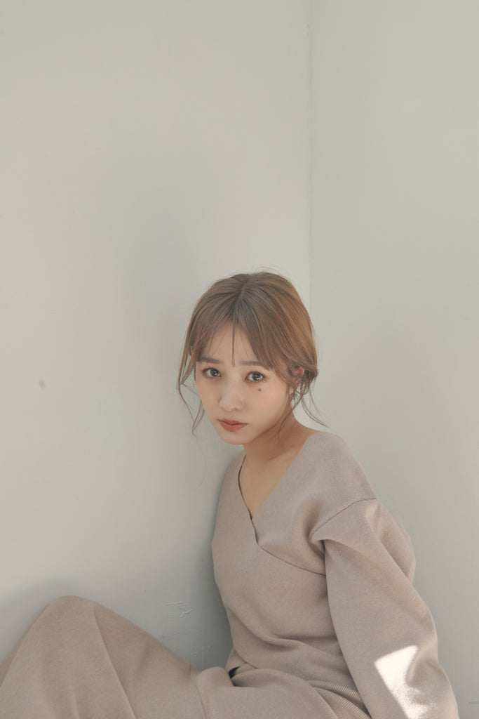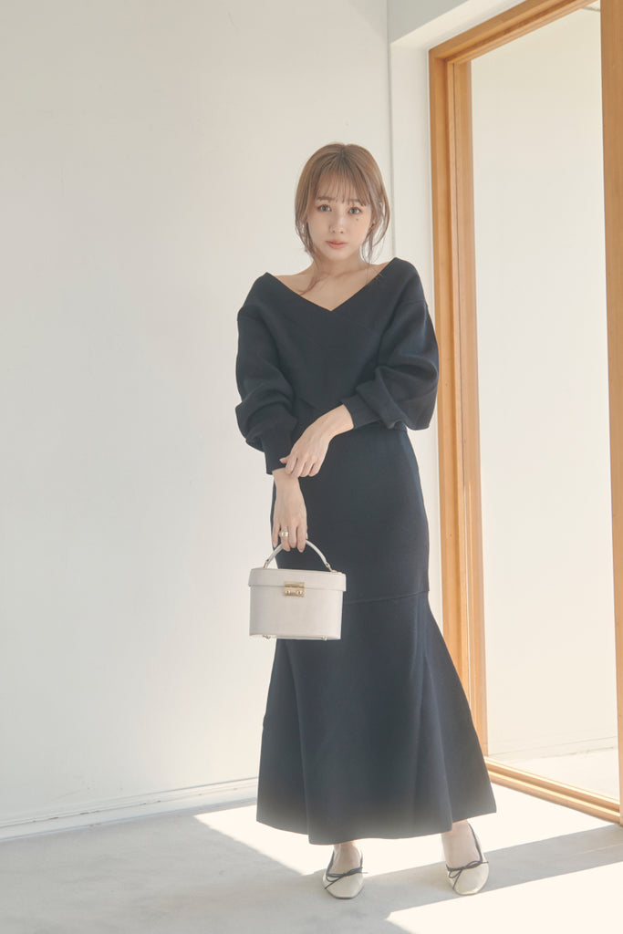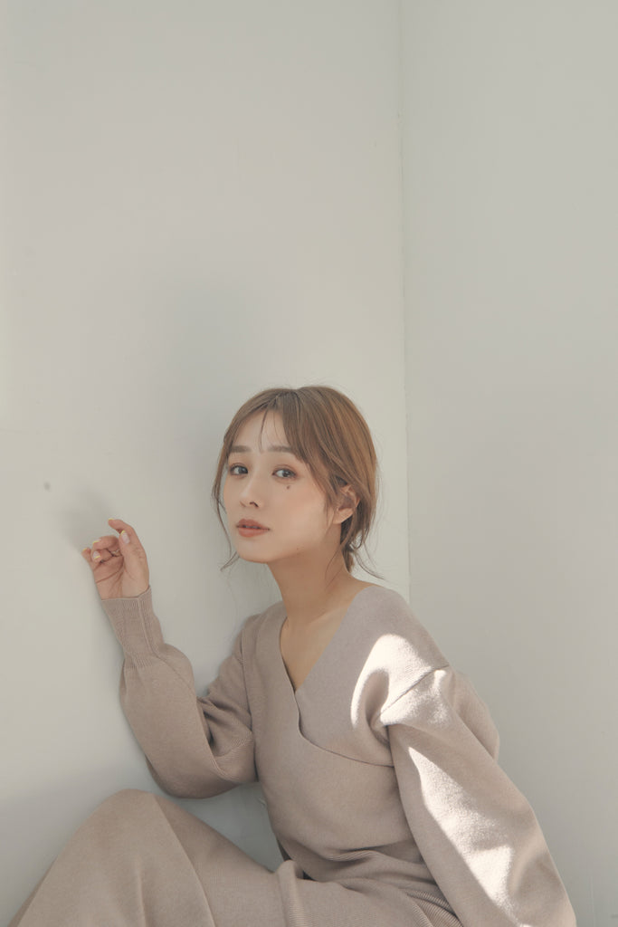 カシュクールのデザインが可愛いニットセットアップです。