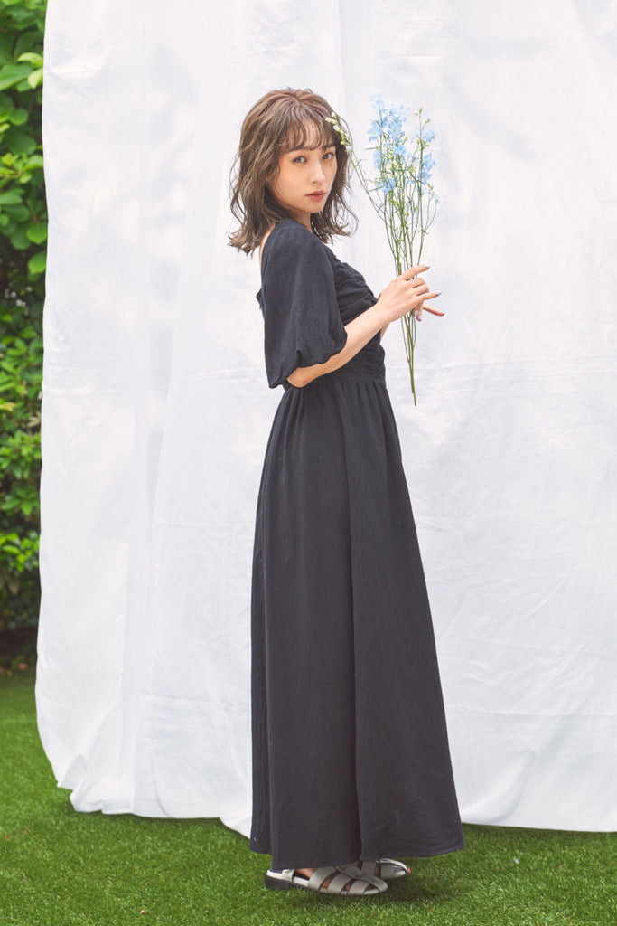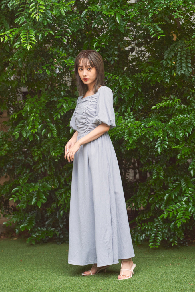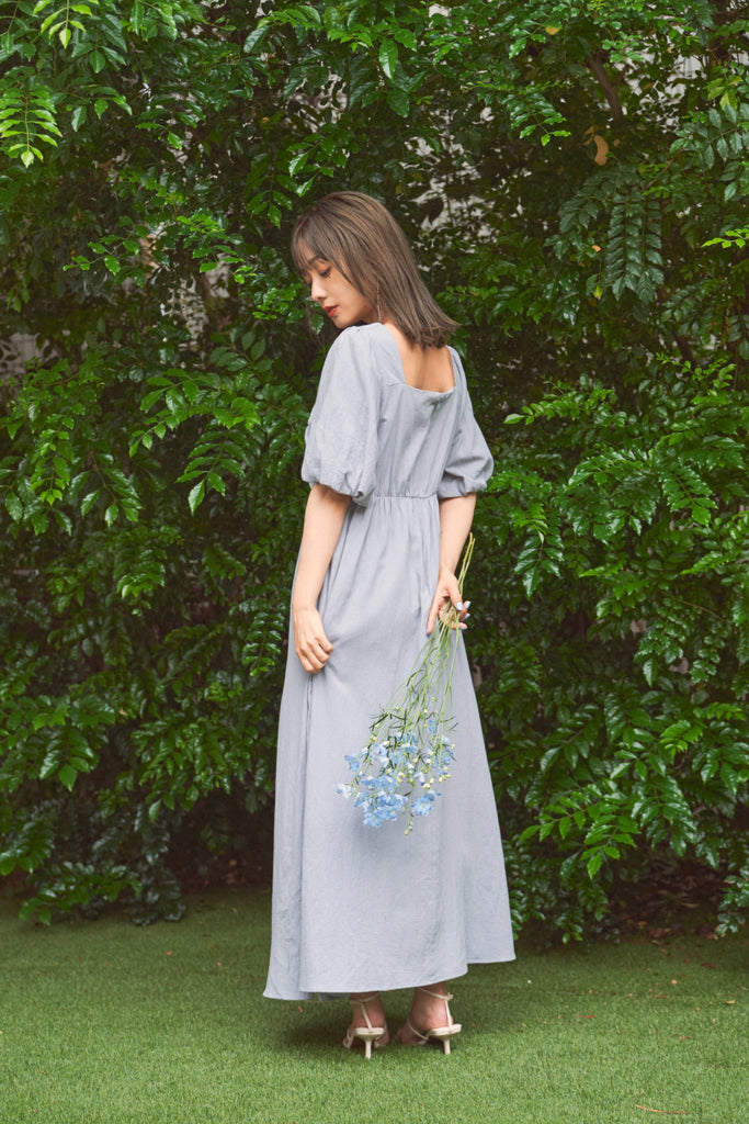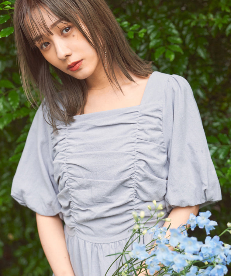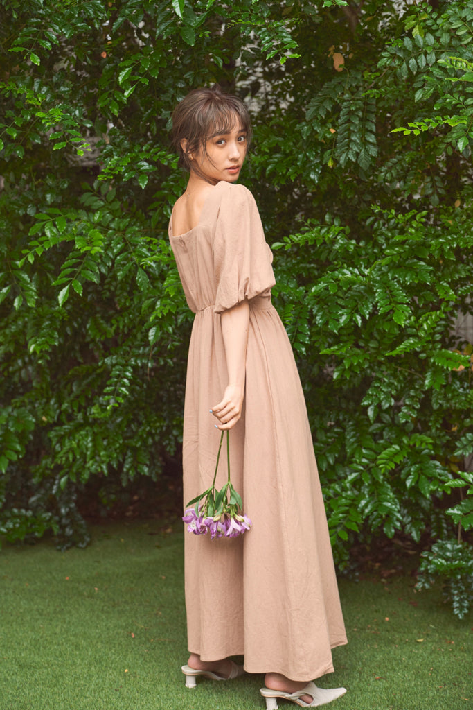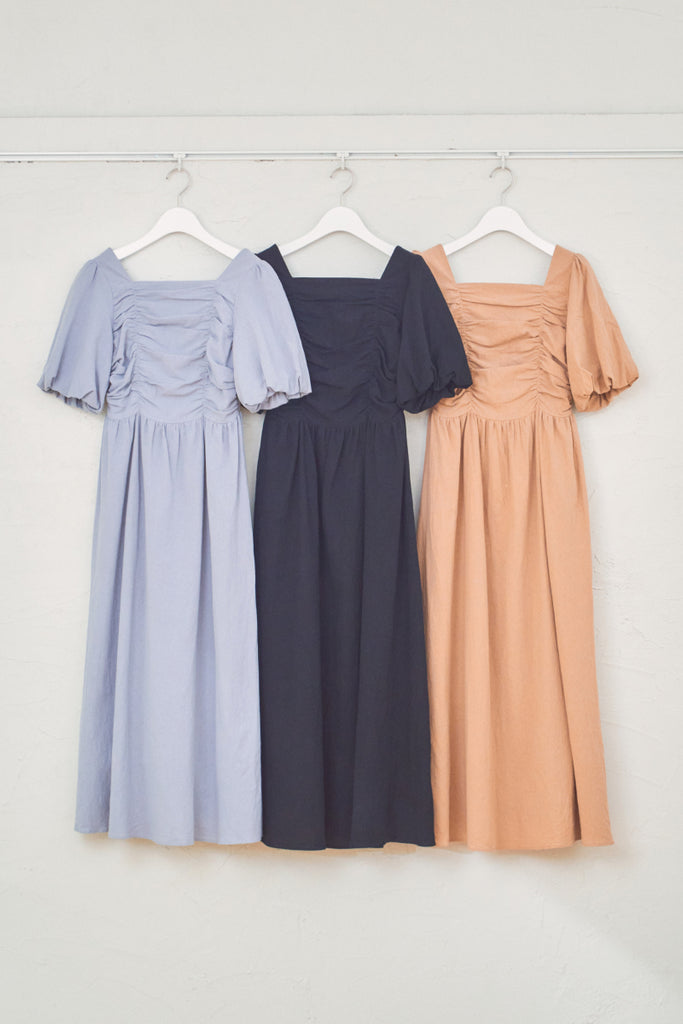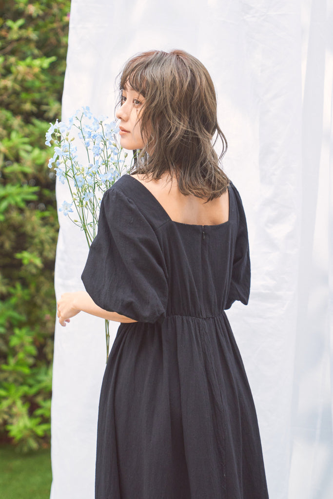 パフスリーブのデザインが可愛いワンピースです!スクエアネックでデコルテラインを綺麗に見せてくれ、ウエストの位置を高めに設定することでスタイルアップ効果があります。ゆったり目なサイズ感でラフにご着用いただけます。