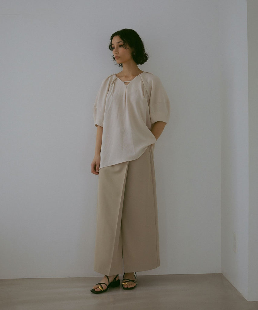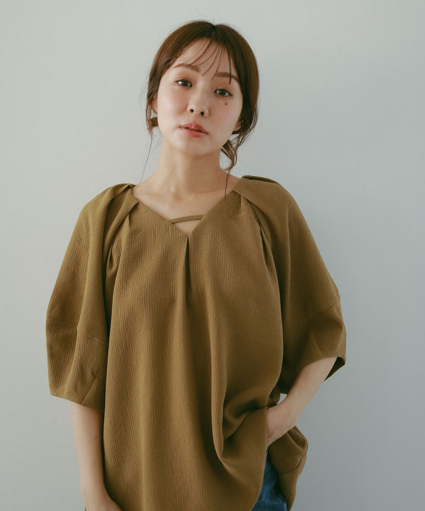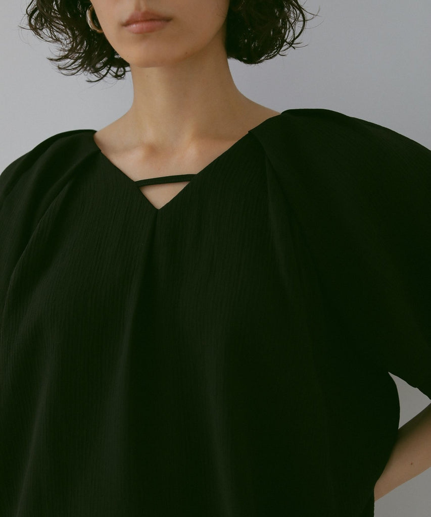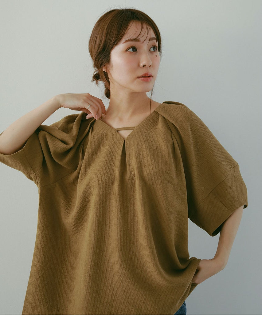 Vネックに華奢な紐を通すことで、シンプルすぎず女性らしさをひき出すデザインに。
