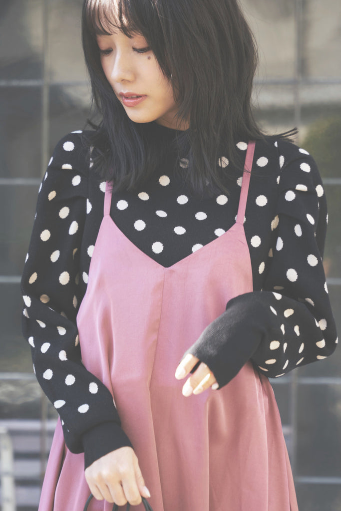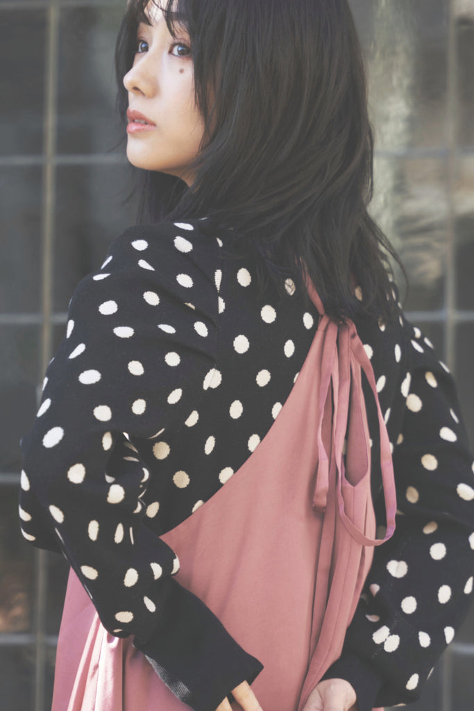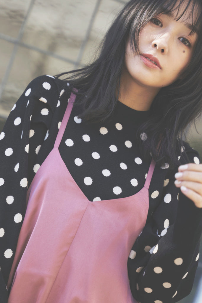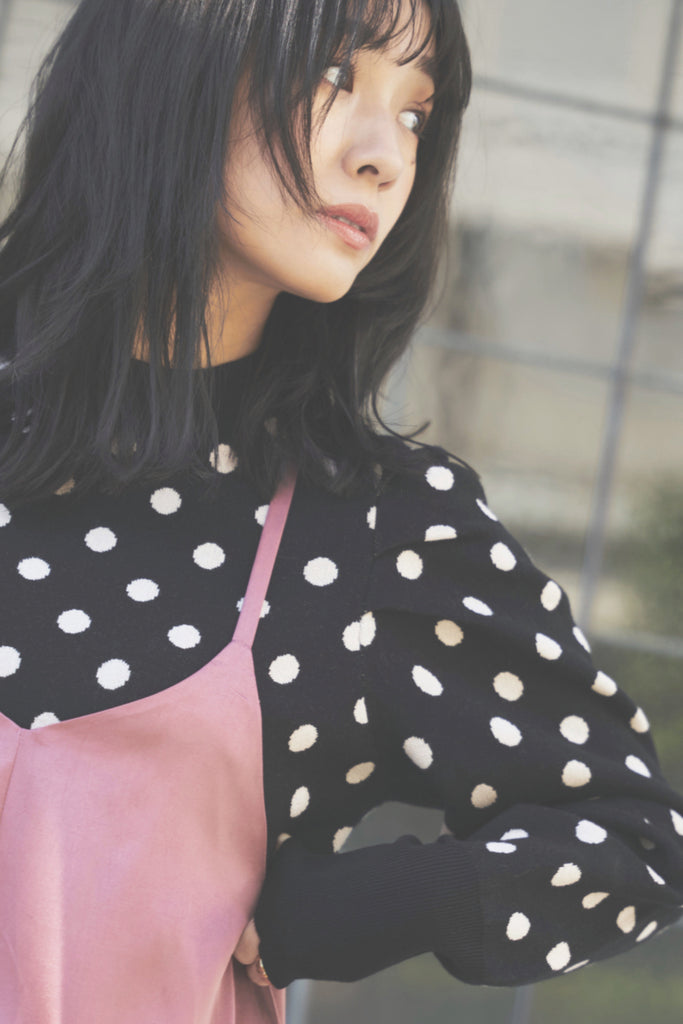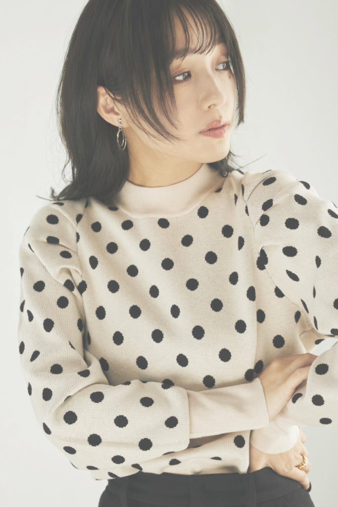 1枚で華やかになるドットニットです。肩のラインはセットインになっているので、パワーショルダーですが強すぎない印象に。シンプルなボトムスに合わせたり、キャミワンピースのインナーなど、レイヤードにも使用いただけます!