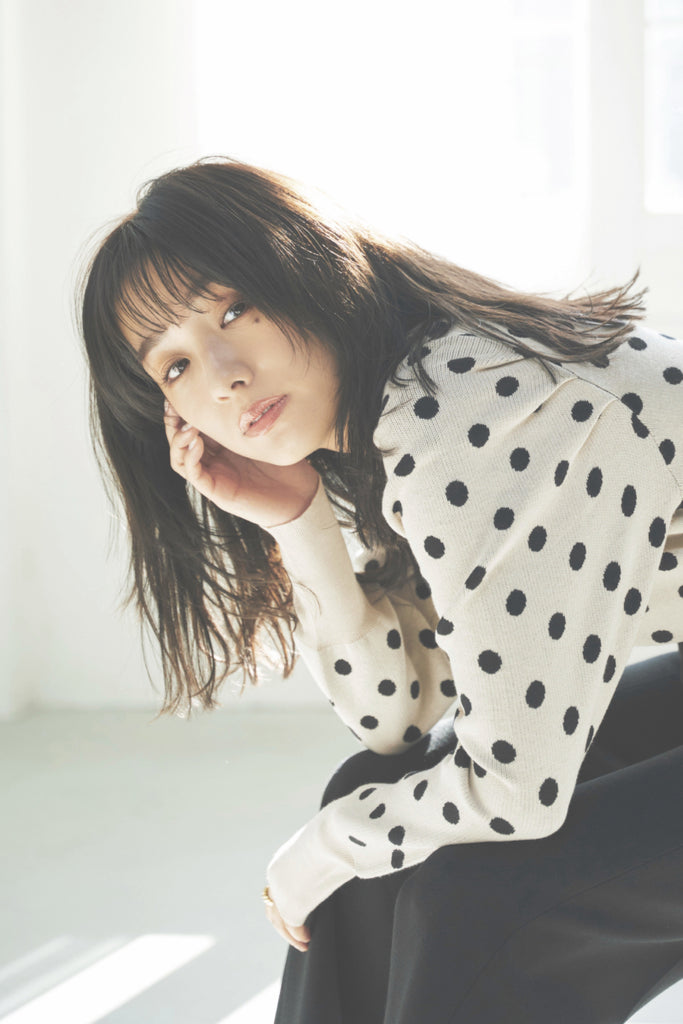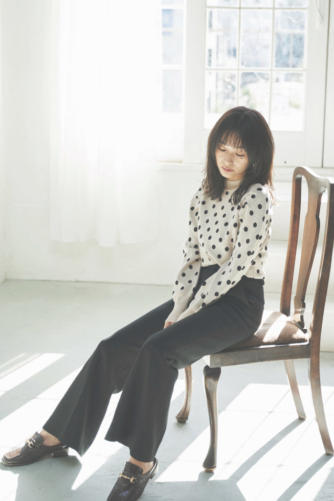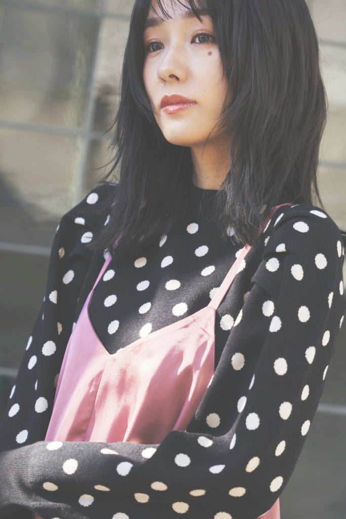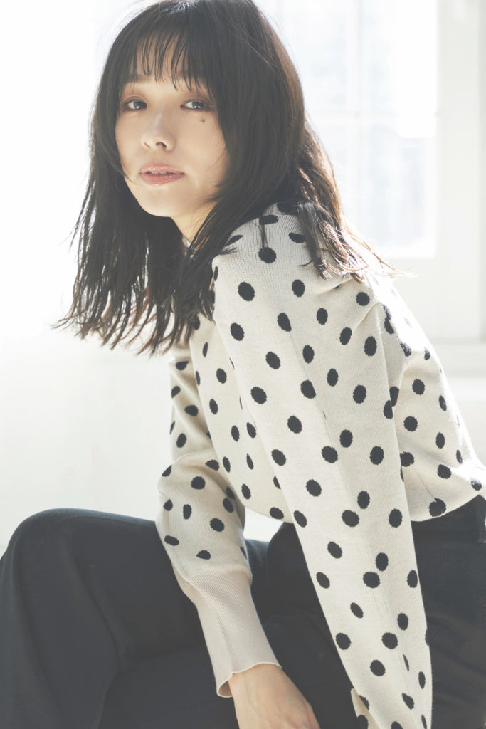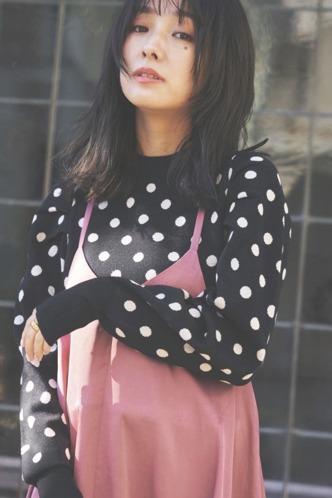 1枚で華やかになるドットニットです。肩のラインはセットインになっているので、パワーショルダーですが強すぎない印象に。シンプルなボトムスに合わせたり、キャミワンピースのインナーなど、レイヤードにも使用いただけます!