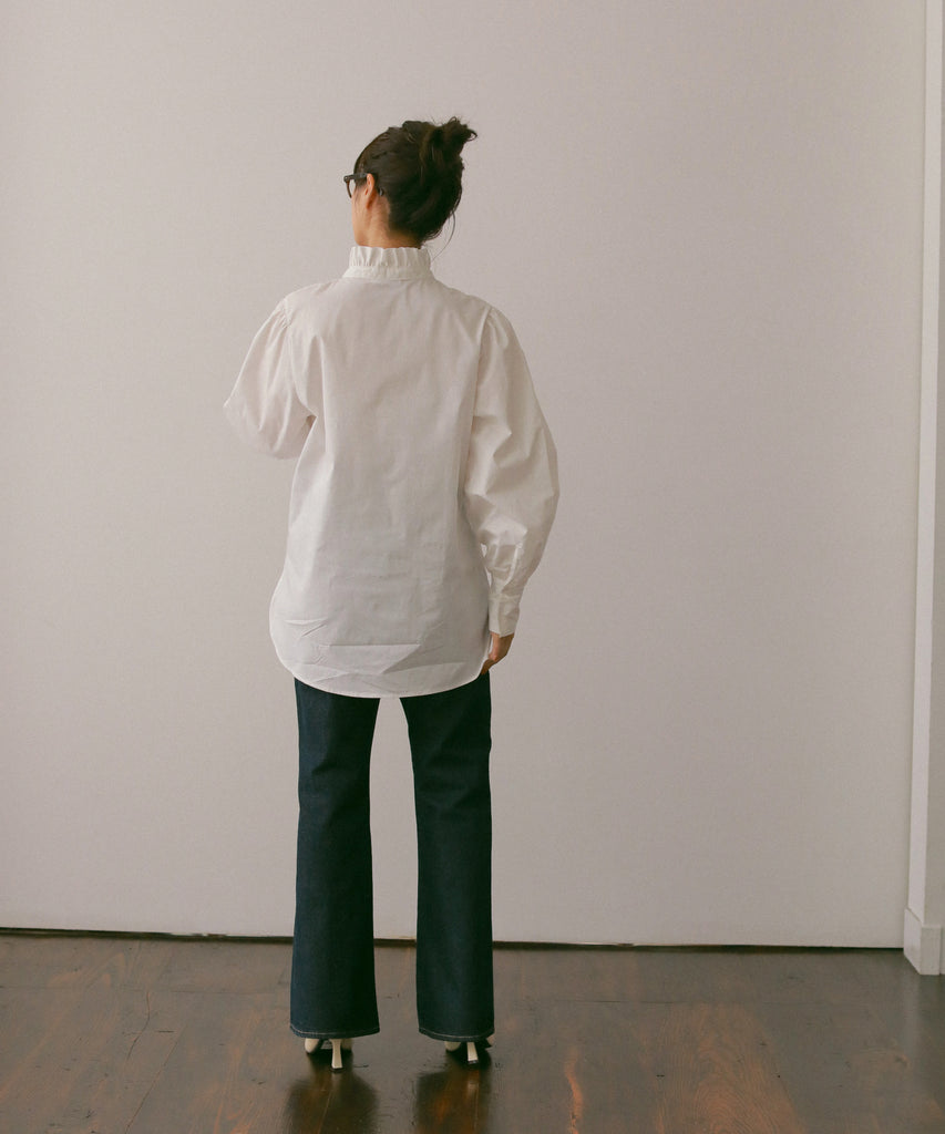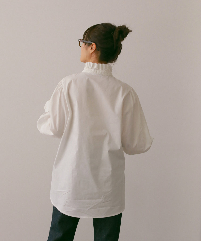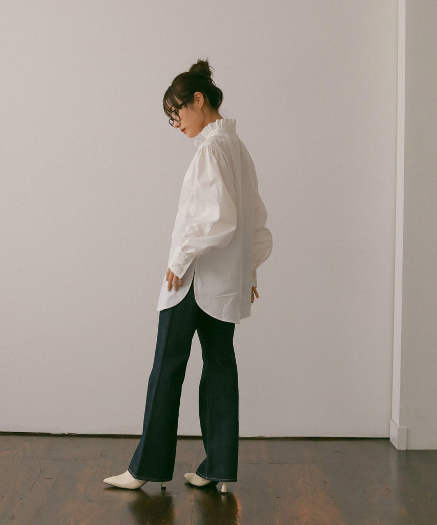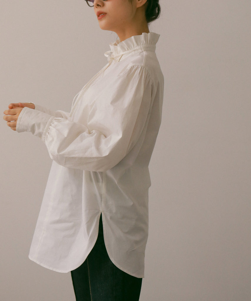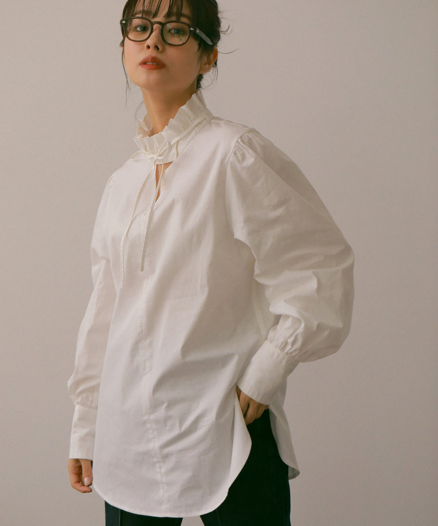 フリルデザインの襟元が目を引くデザインシャツです。少し長めのカフスは上品な印象を与えてくれます。お尻が隠れる着丈なので、1枚で着用しても◎両サイドに入ったスリットは、抜け感を出してくれます。1枚でもベストやワンピース等とレイヤードしても、着回しできる万能シャツです!