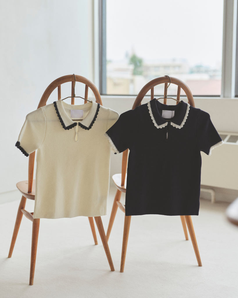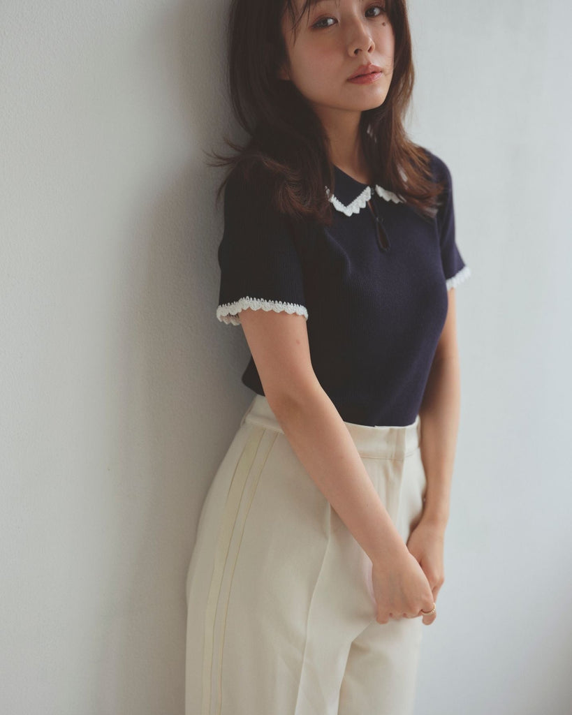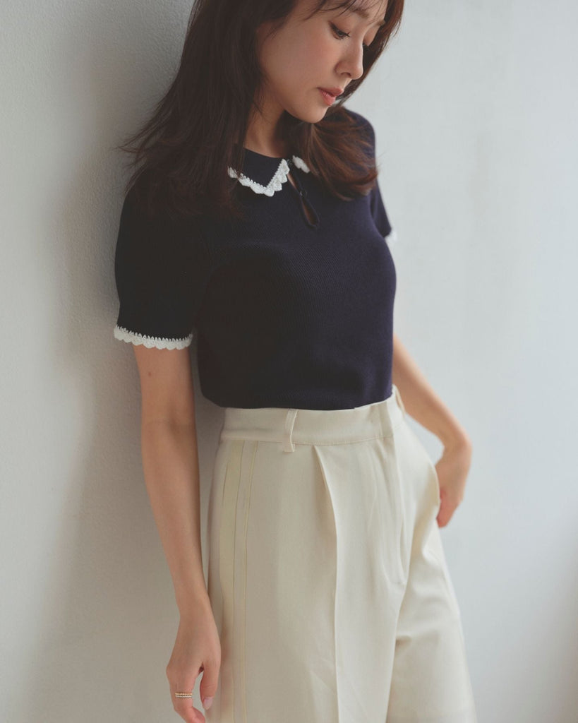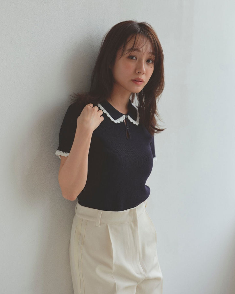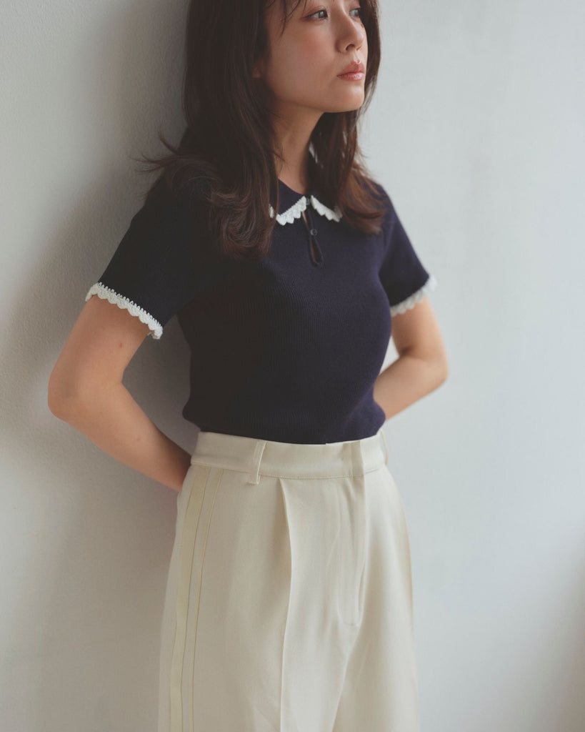 ポロシャツのきちんと感とニットのやわらかさを兼ね備えた春夏の主役級トップス。襟端と袖口にレース編みでトリミングし全体を引き締めるポイントに。フロントは程よい肌見せのボタン開きにしており、女性らしく上品な印象が魅力。コンパクトなサイズ感で着回し力抜群のトップス。しっとりとし清涼感のあるニット素材を使用しており、暑くなるこれからの季節にも快適にご着用いただけます。