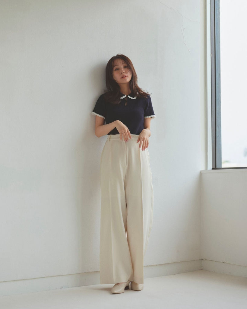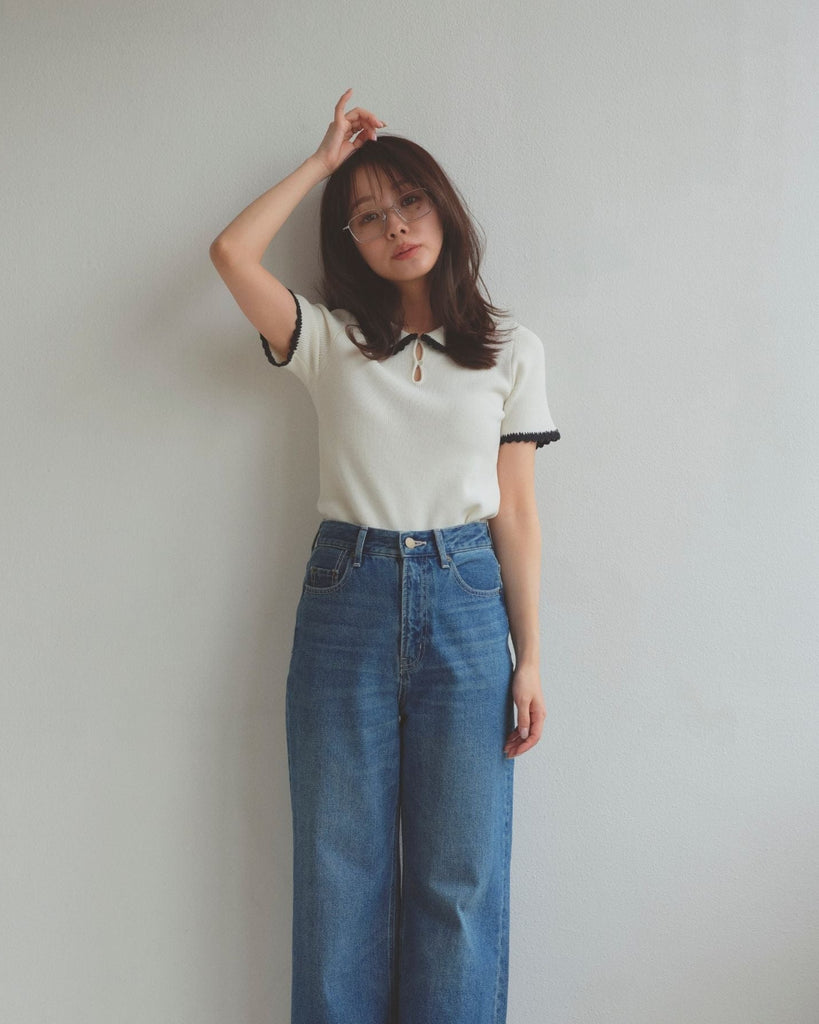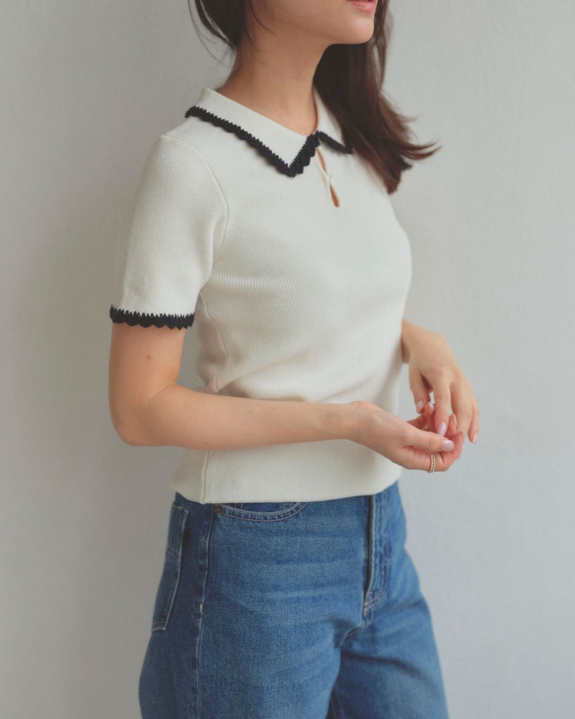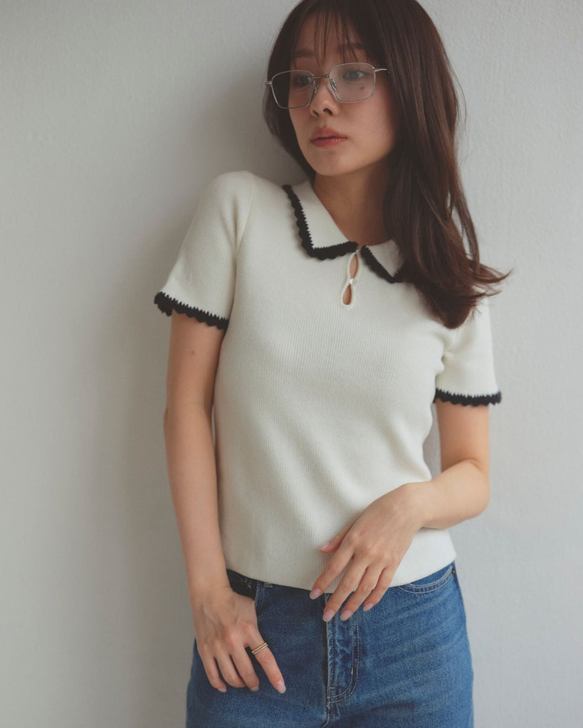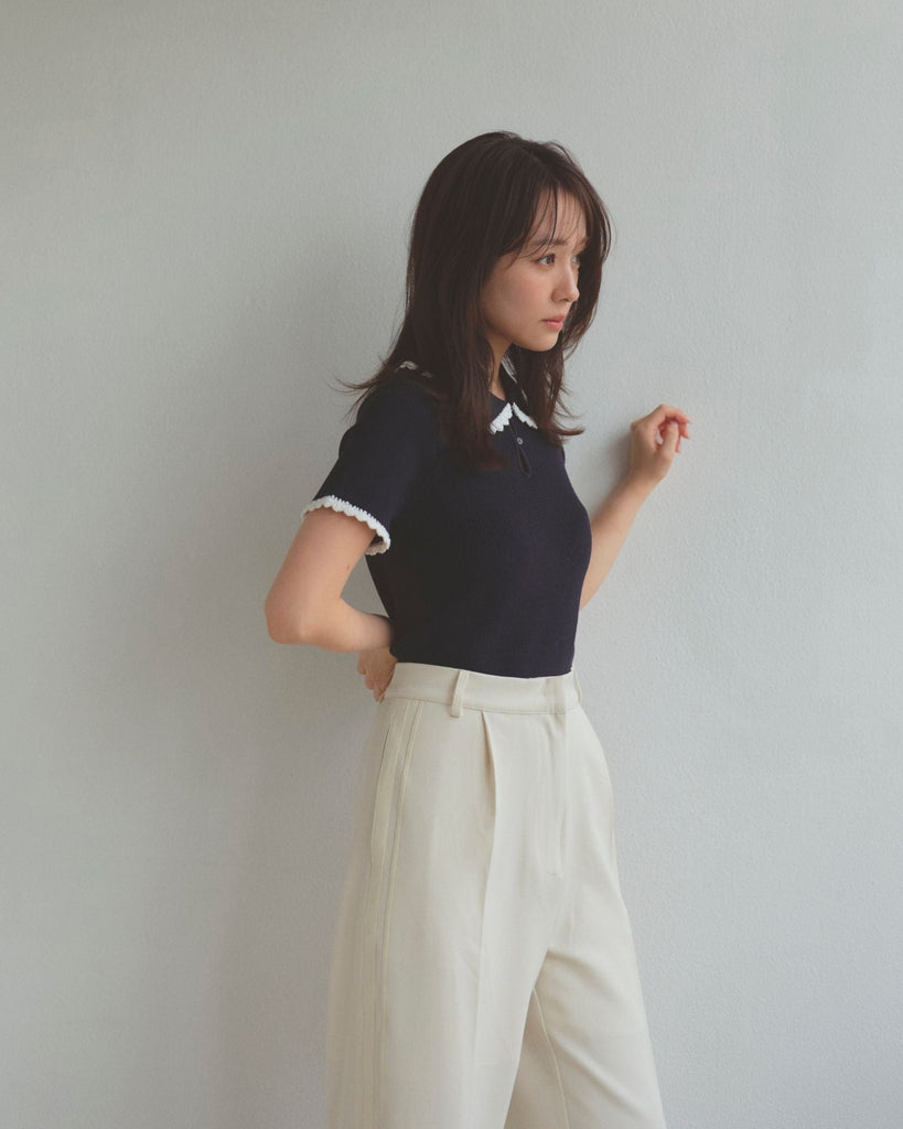 ポロシャツのきちんと感とニットのやわらかさを兼ね備えた春夏の主役級トップス。襟端と袖口にレース編みでトリミングし全体を引き締めるポイントに。フロントは程よい肌見せのボタン開きにしており、女性らしく上品な印象が魅力。コンパクトなサイズ感で着回し力抜群のトップス。しっとりとし清涼感のあるニット素材を使用しており、暑くなるこれからの季節にも快適にご着用いただけます。