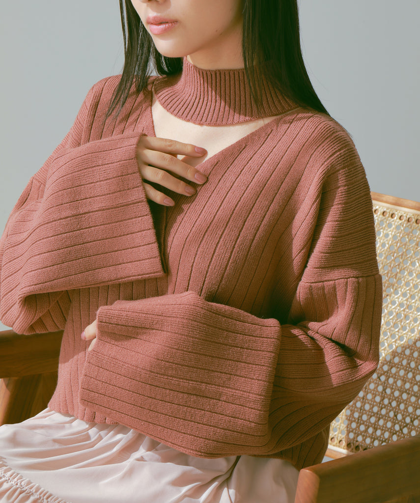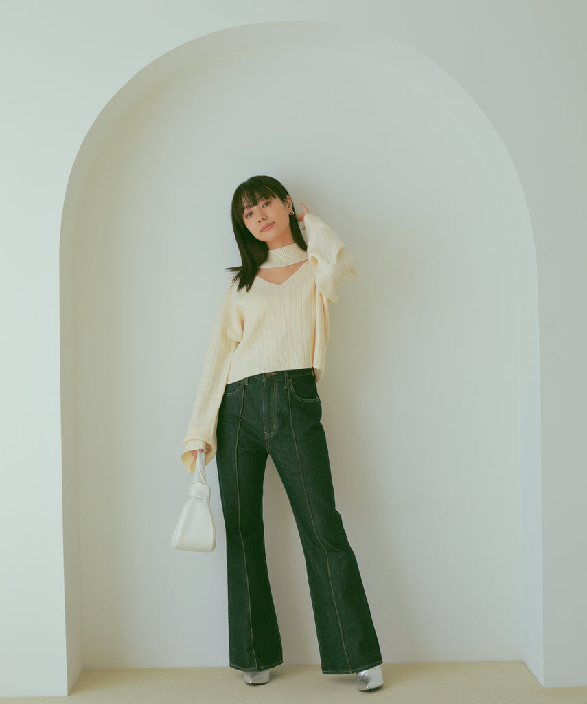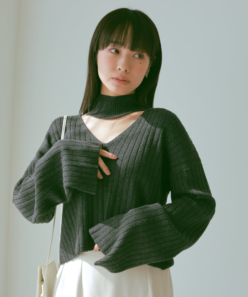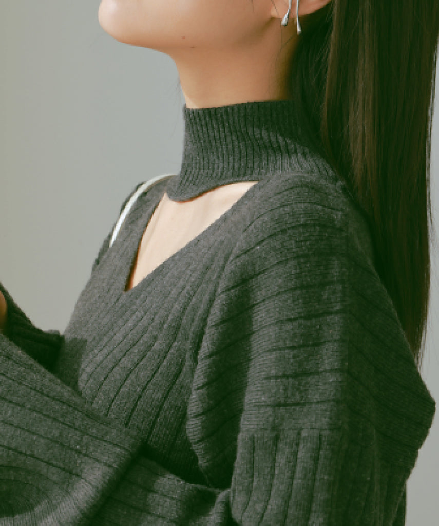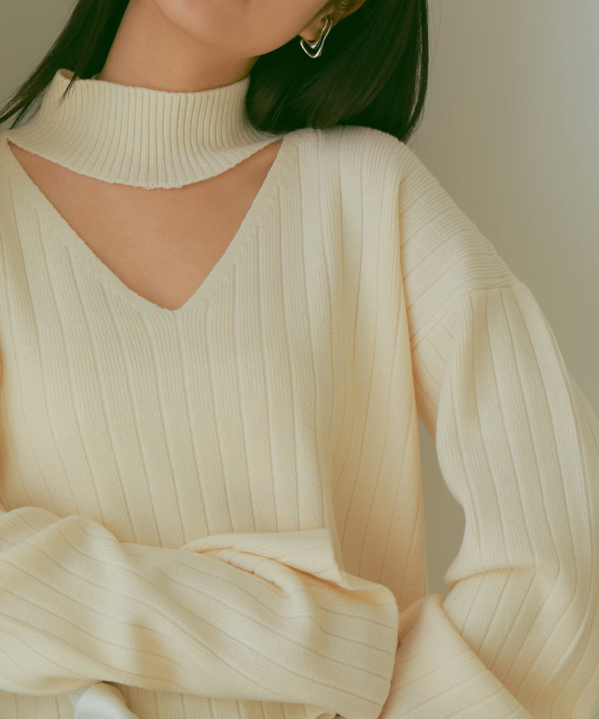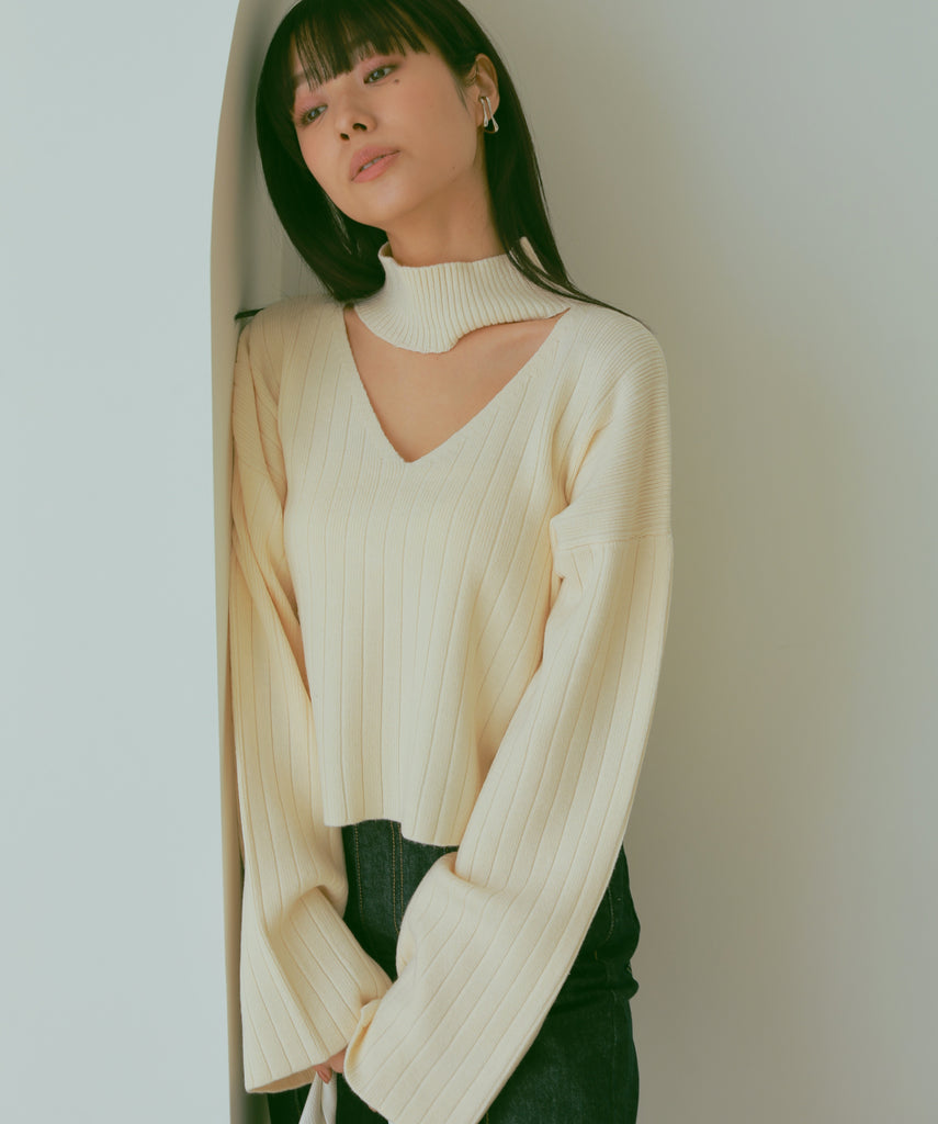 首元に抜け感のあるデザインニットです。袖にボリュームはありますが、着丈はコンパクトなので全体はスッキリ。重たくなりがちな冬のコーディネートに抜け間を与えてくれる1枚です。