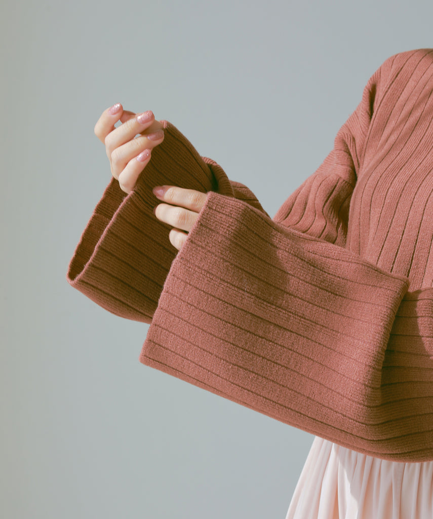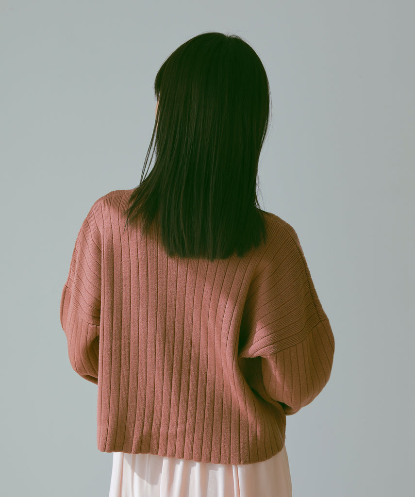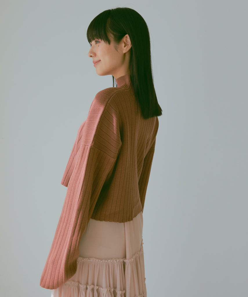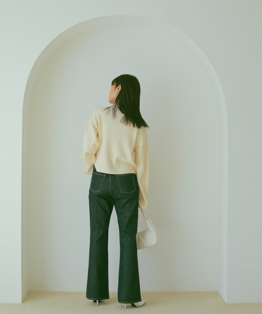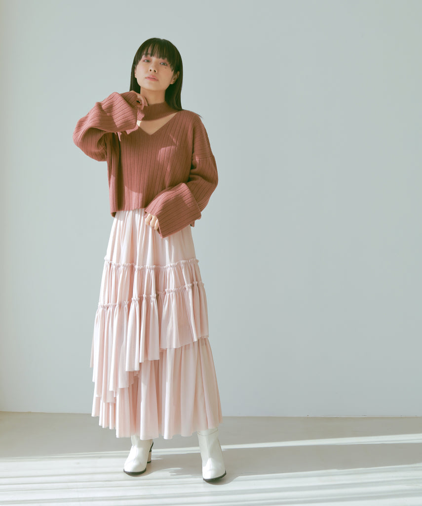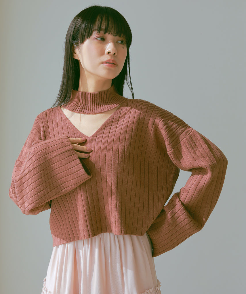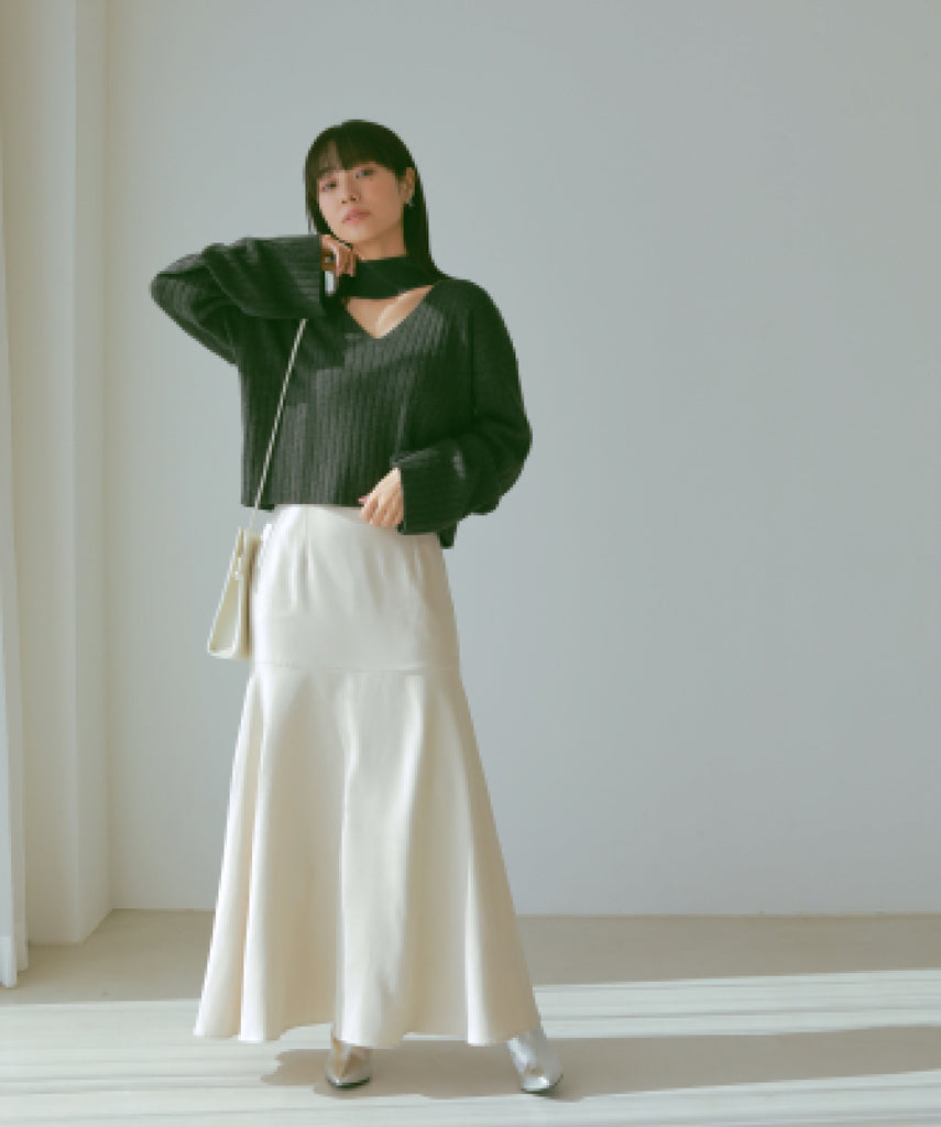 首元に抜け感のあるデザインニットです。袖にボリュームはありますが、着丈はコンパクトなので全体はスッキリ。重たくなりがちな冬のコーディネートに抜け間を与えてくれる1枚です。