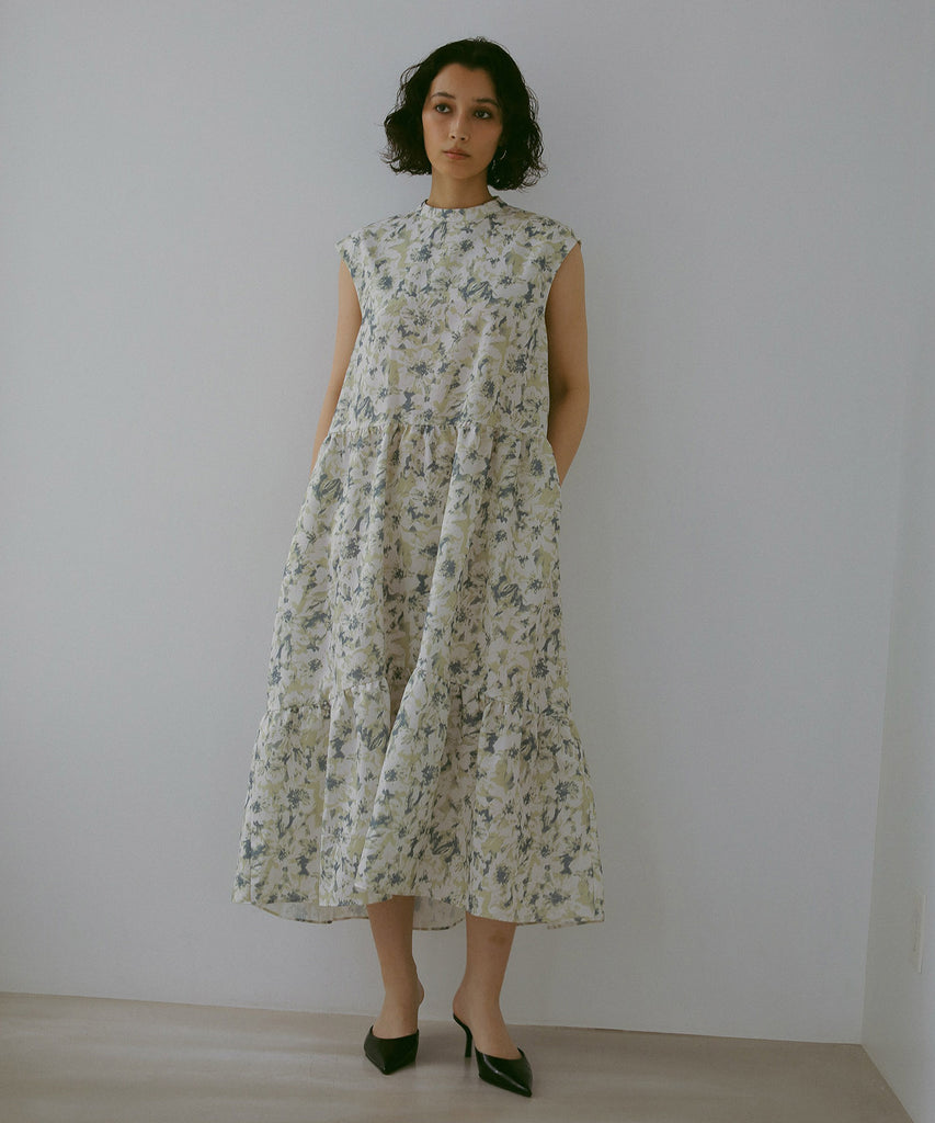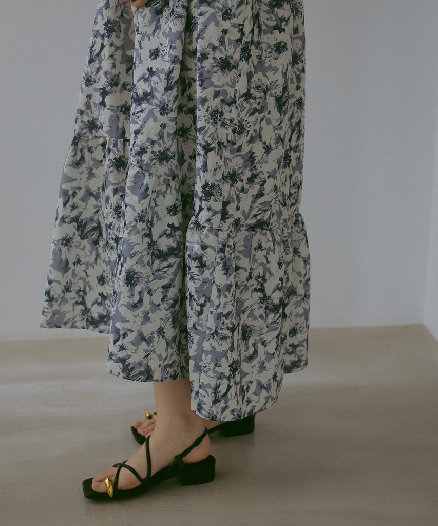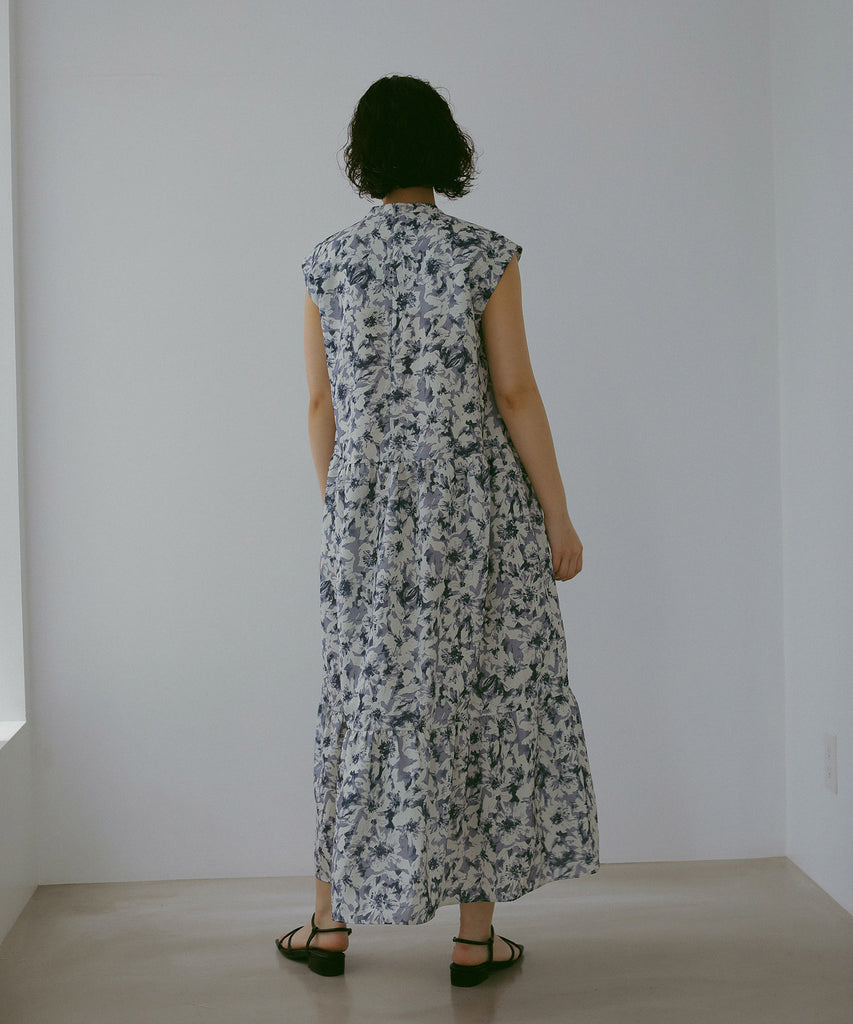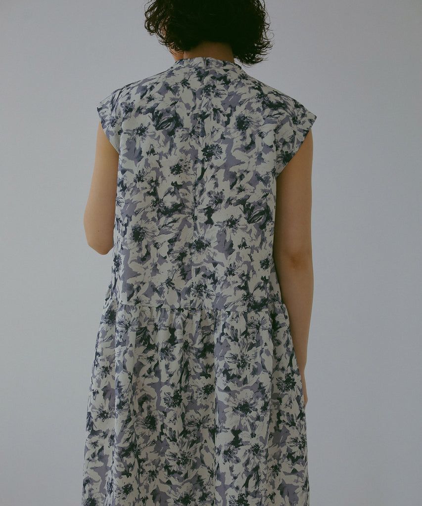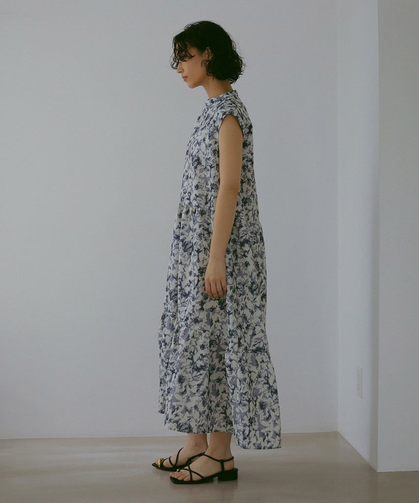 繊細なタッチのフラワープリントを全面に施したティアードワンピース。ニュアンスのあるカラーリングで上品な印象を纏える一枚。軽くてシワになりにくい素材感で手洗い可能なイージーケア。ふんわりとしたボリュームで、綺麗に体型をカバーしてくれるAラインシルエットが魅力です。フレンチスリーブにすることで気になる二の腕周りをスッキリと見せてくれます。 同素材でフラワープリントナロースカートのご用意もございます。