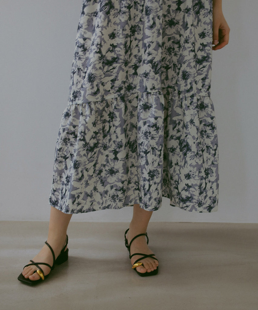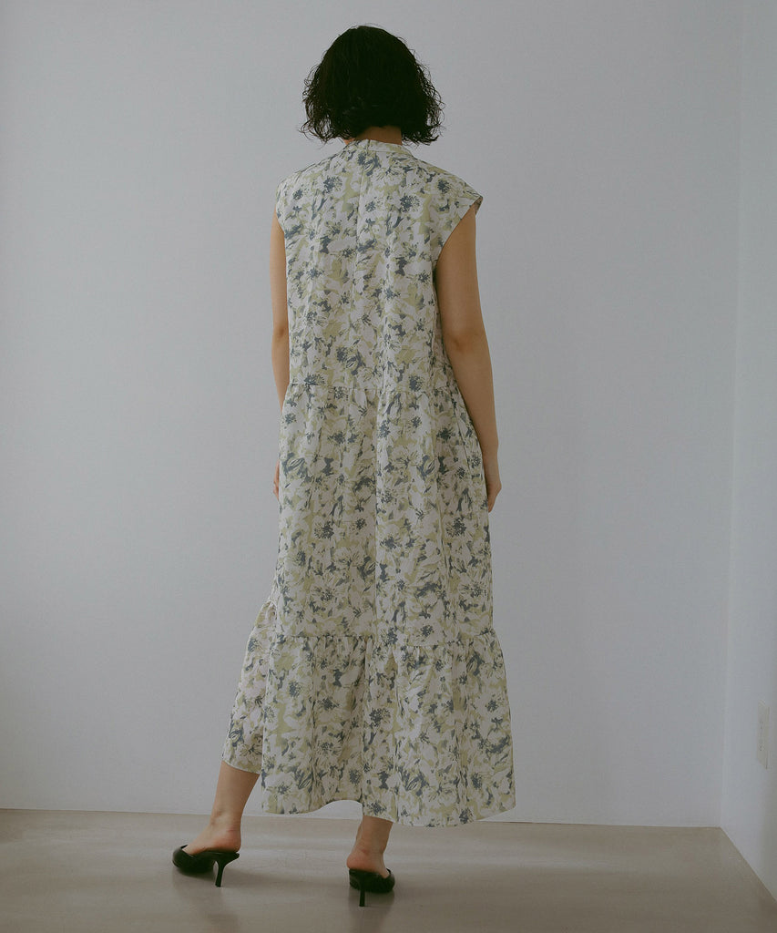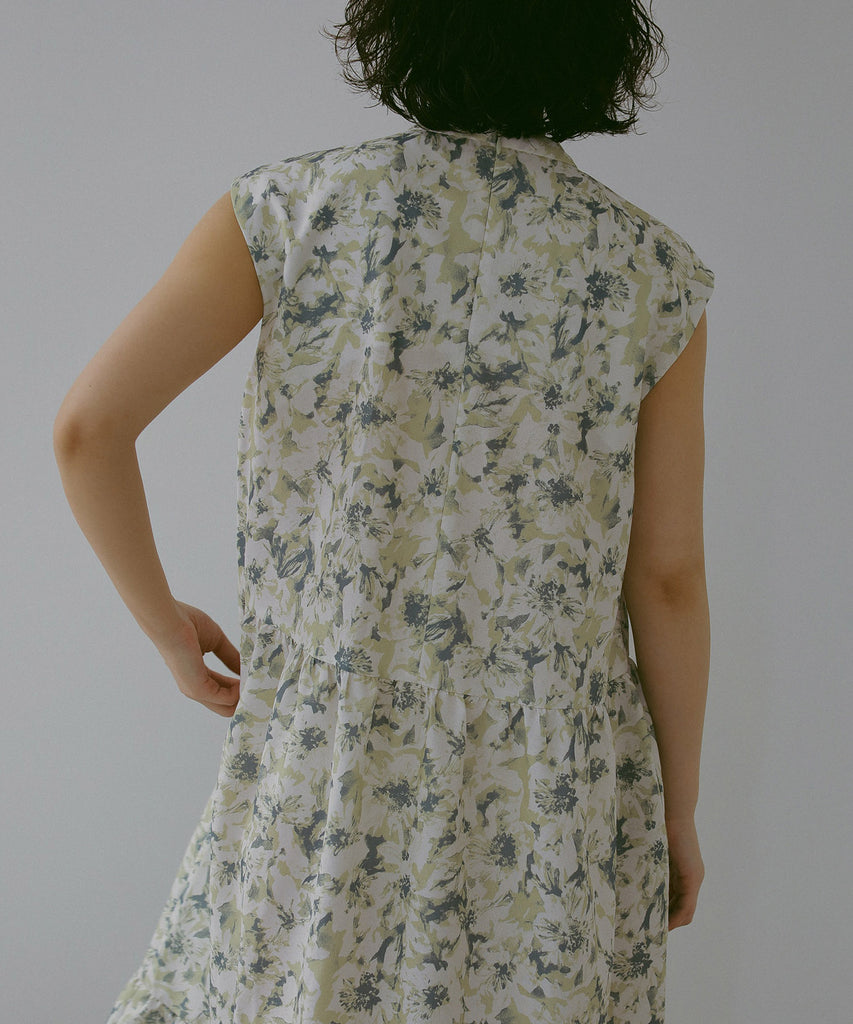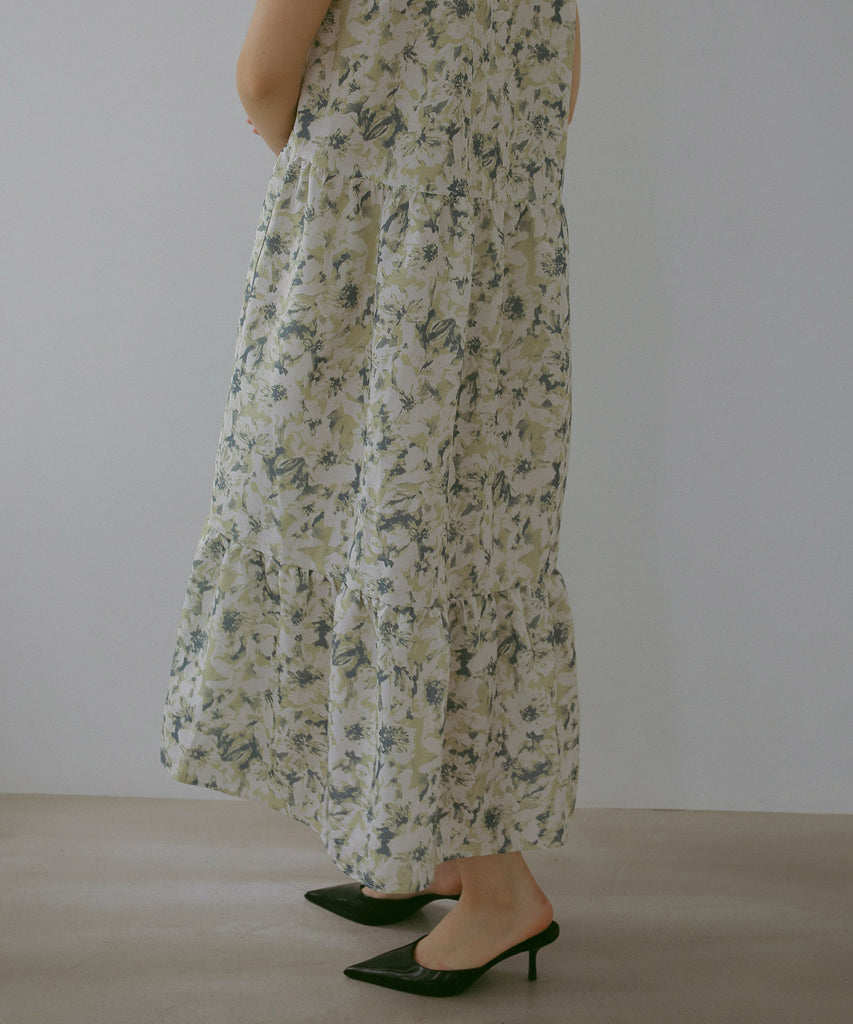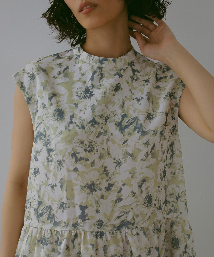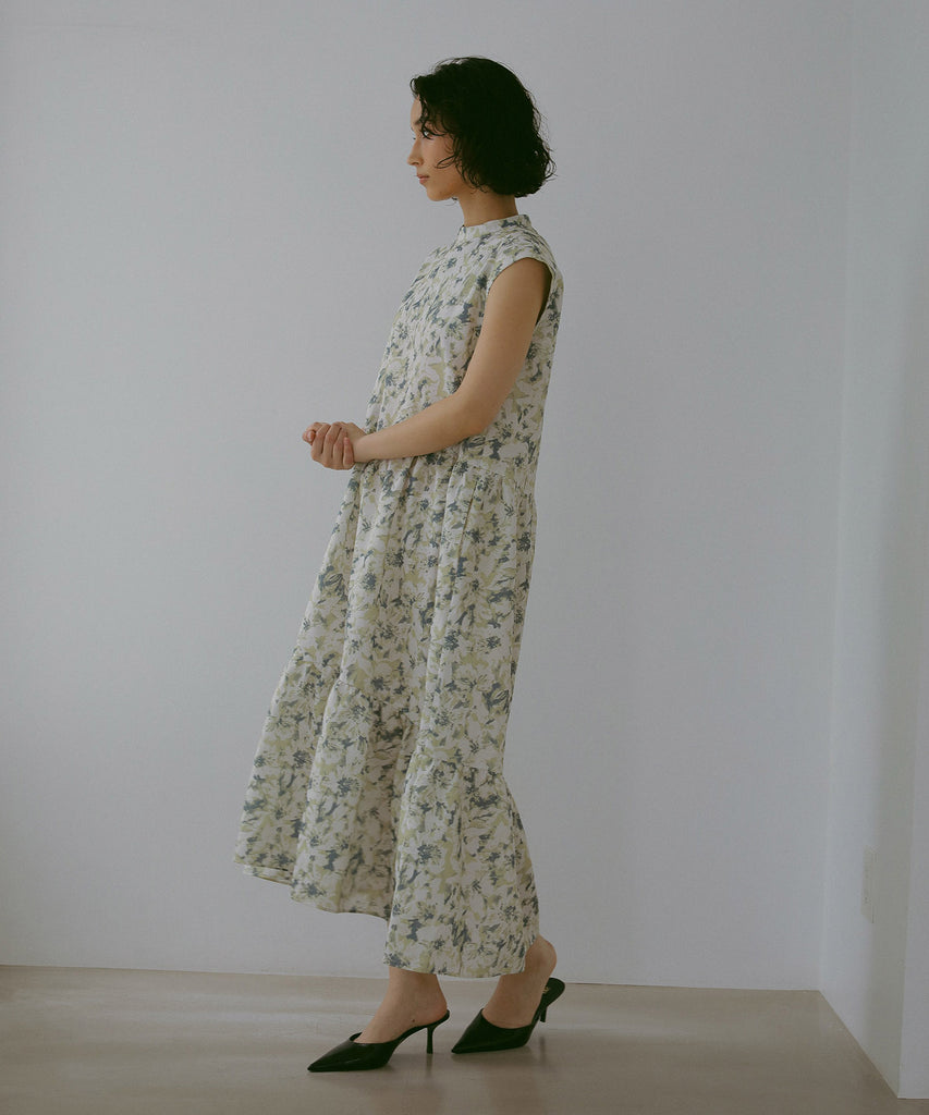 繊細なタッチのフラワープリントを全面に施したティアードワンピース。ニュアンスのあるカラーリングで上品な印象を纏える一枚。軽くてシワになりにくい素材感で手洗い可能なイージーケア。ふんわりとしたボリュームで、綺麗に体型をカバーしてくれるAラインシルエットが魅力です。フレンチスリーブにすることで気になる二の腕周りをスッキリと見せてくれます。 同素材でフラワープリントナロースカートのご用意もございます。