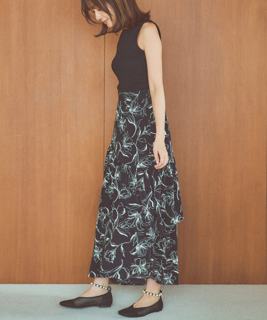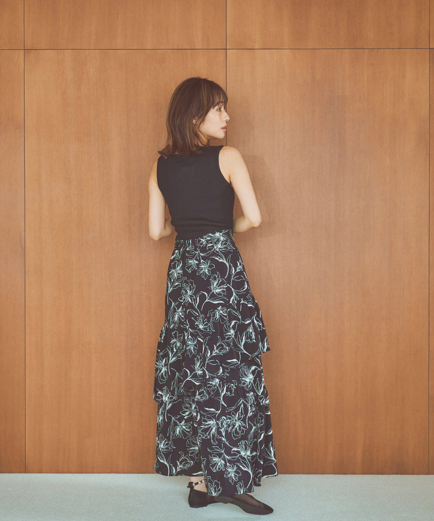 ティアードデザインがアクセントのスカートです。たっぷりと生地を使用しており、揺れるシルエットがとても綺麗です。シンプルなトップスと合わせるだけで主役コーデが完成します!