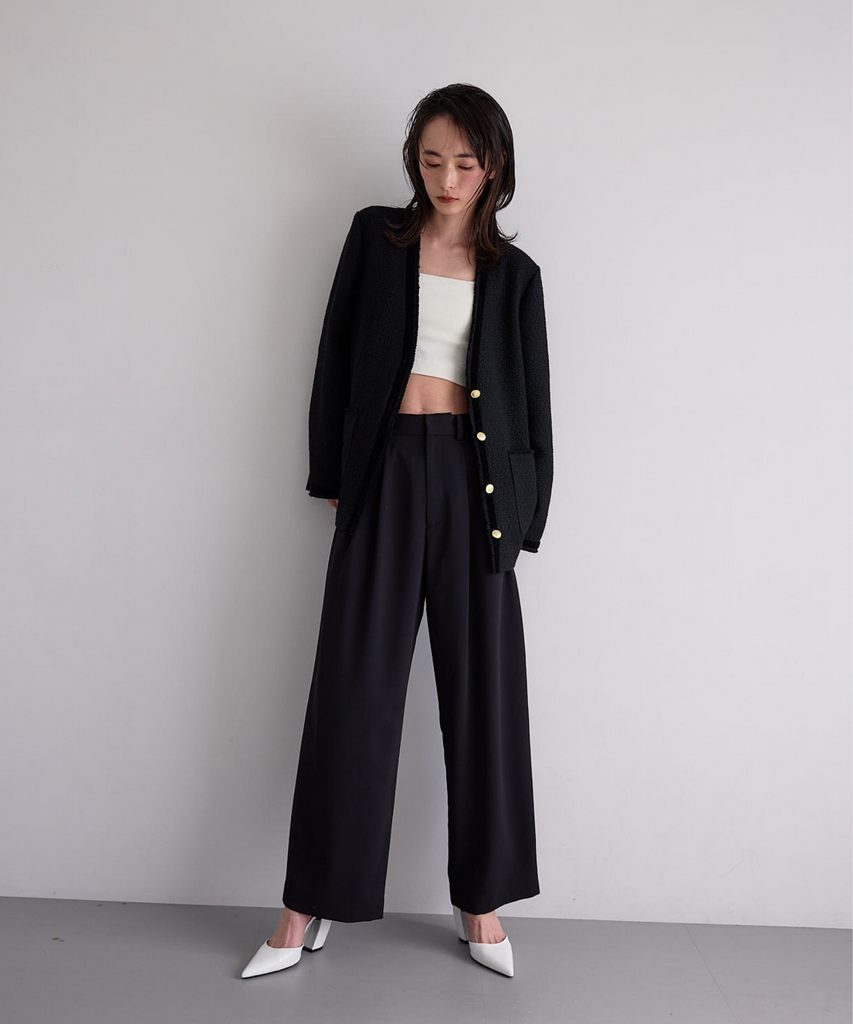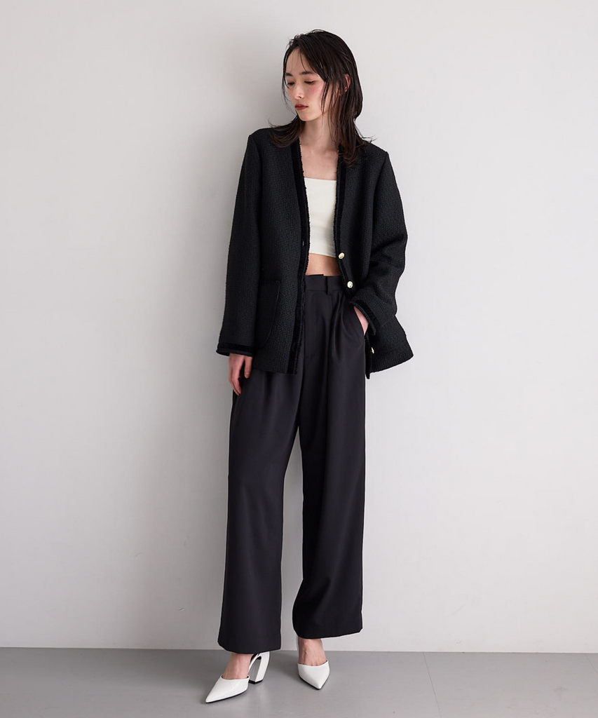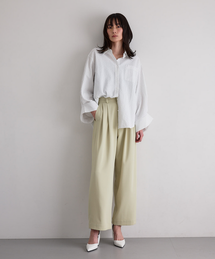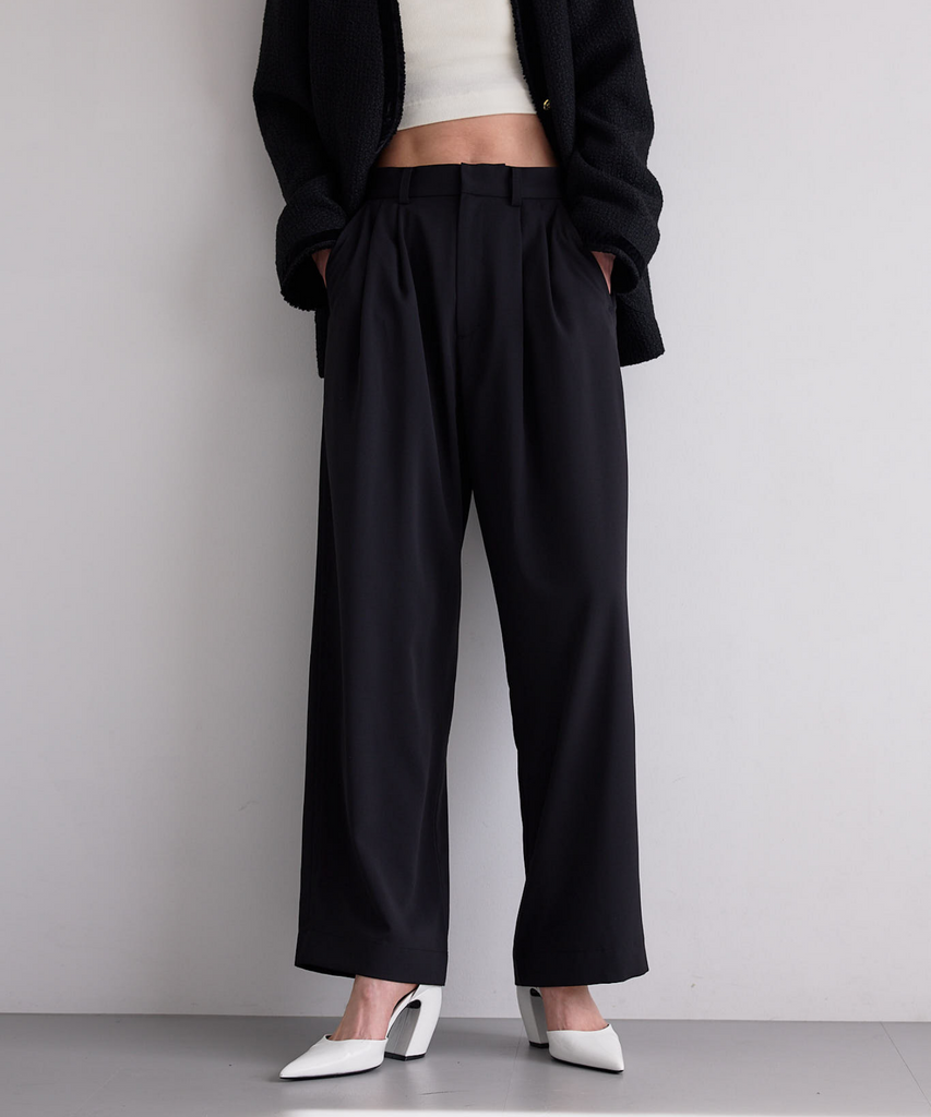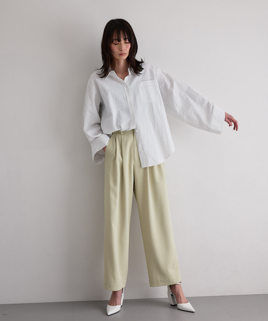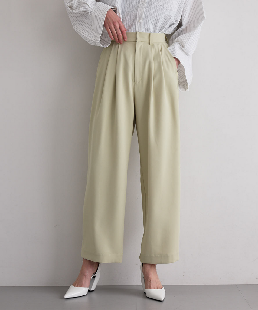 オールシーズンで着用可能な万能パンツ。 シワになりにくく透けにくい程良い厚さと、落ち感のある素材を使用し、滑らかに身体に沿うシルエットは、脚を長くキレイに見せてくれる効果があります。 前部分にはタックを入れて腰回りをカバーし、またウエストの後ろ部分はゴム仕様を採用し、ストレスなく履きごごちの良さを追求しました。 Tシャツやブラウスはもちろん、秋冬のニット等、様々なシーンでコーディネートいただけます。