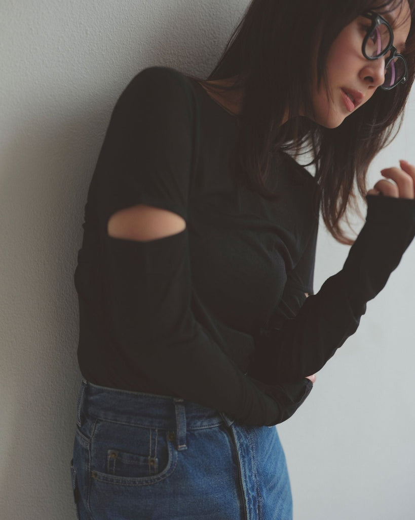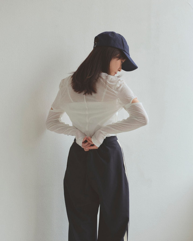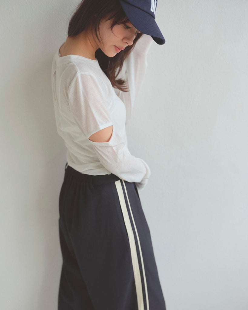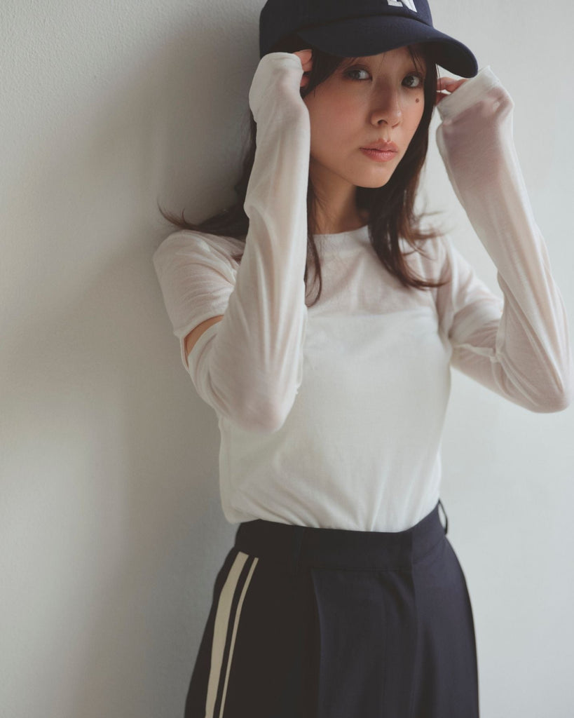 程よい肌見せのスリットがポイントのロングスリーブトップス。控えめなショルダースリットで大人の抜け感をプラス。繊細なシアー感のあるカットソー素材で伸縮性に富み、デイリー使いしやすい生地感も魅力。襟ぐりと袖口はさりげなく生地を重ねたデザインで、シンプルさの中にこだわりを詰めた一枚。