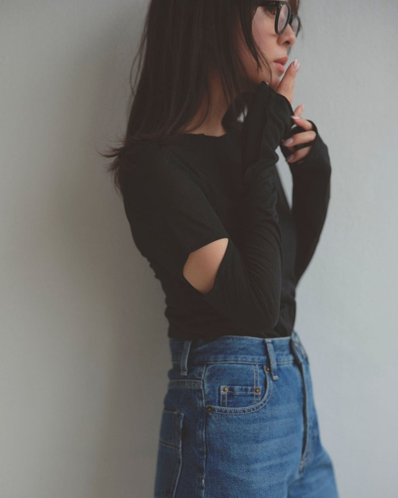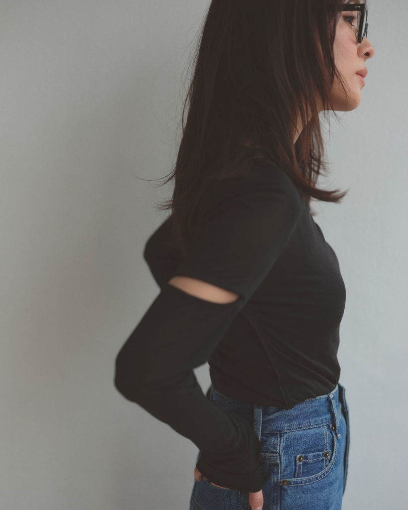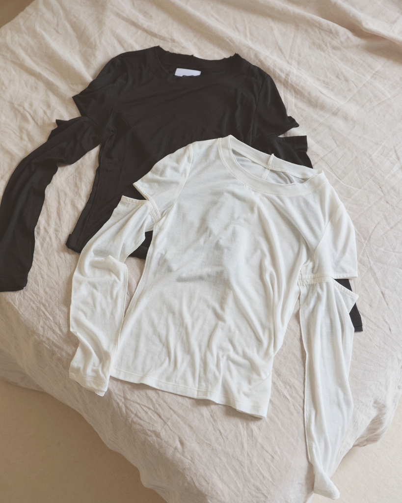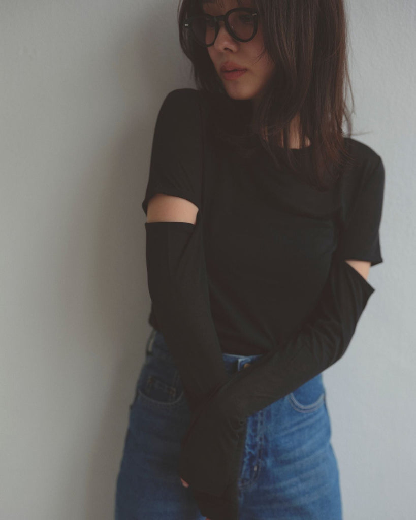 程よい肌見せのスリットがポイントのロングスリーブトップス。控えめなショルダースリットで大人の抜け感をプラス。繊細なシアー感のあるカットソー素材で伸縮性に富み、デイリー使いしやすい生地感も魅力。襟ぐりと袖口はさりげなく生地を重ねたデザインで、シンプルさの中にこだわりを詰めた一枚。