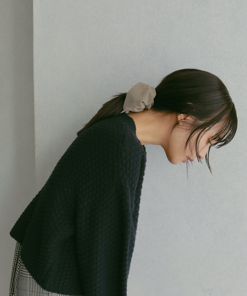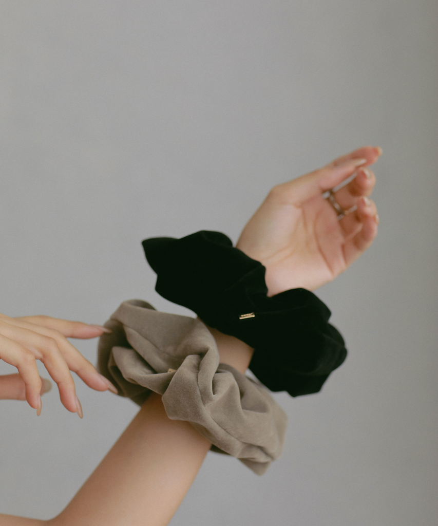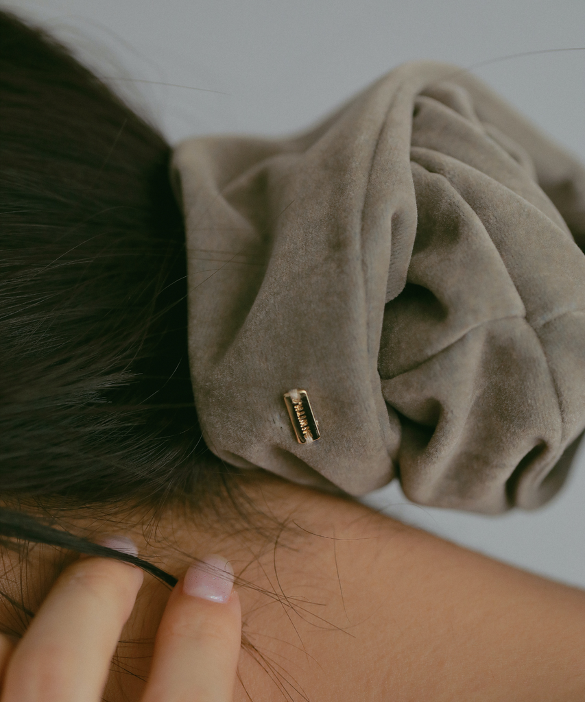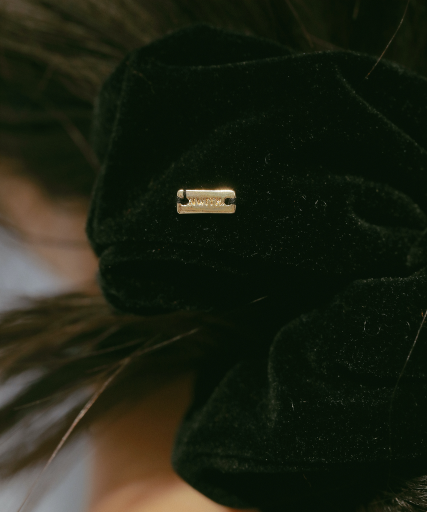 キレイなベロア調の素材と落ち着いたカラーで大人っぽい雰囲気のシュシュ。 季節感のある素材で、高級感があり、どんなスタイルにも合わせていただけます。 小さなブランドプレートがさらにアクセントに。